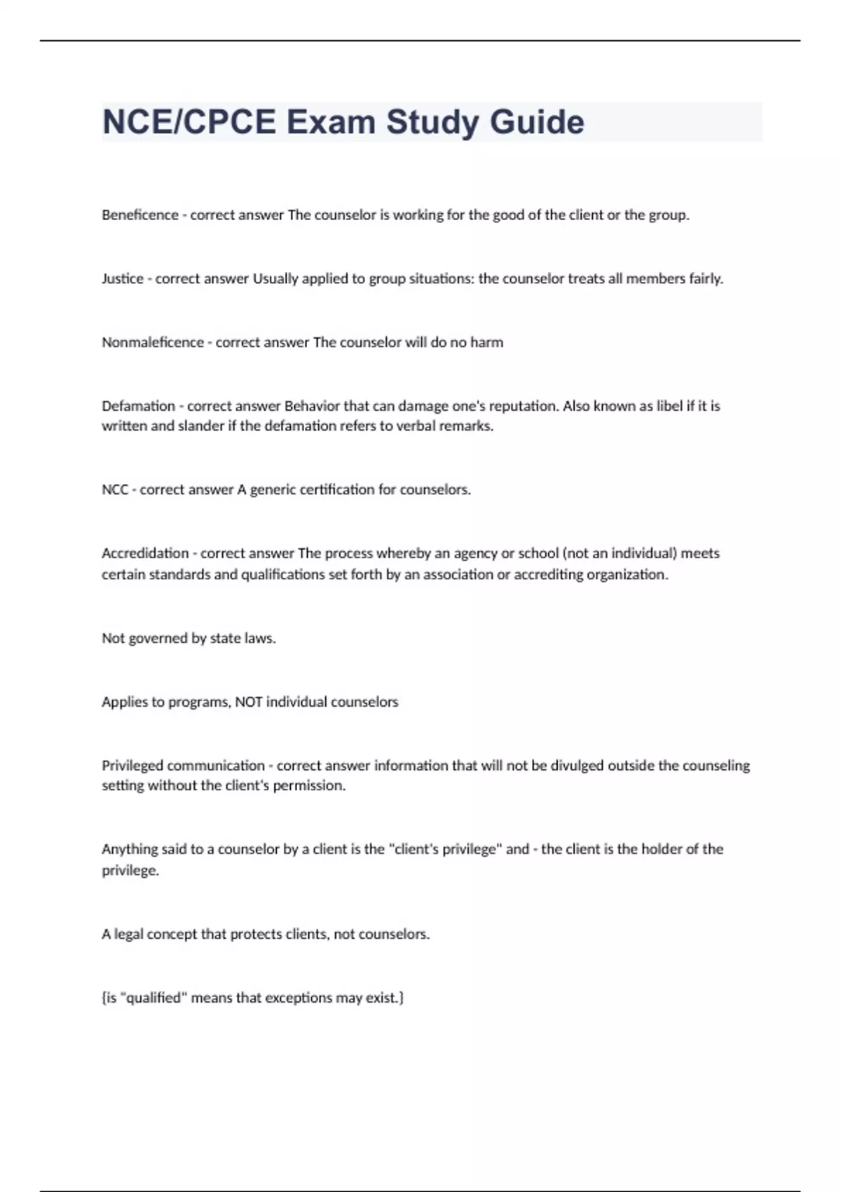 NCE/CPCE Exam Study GuideBeneficence - correct answer The counselor is working for the good of the client or the group. Justice - correct answer Usually applied to group situations: the counselor treats all members fairly. Nonmaleficence - correct answer The counselor will do no harm Defamation - correct answer Behavior that can damage one's reputation. Also known as libel if it is written and slander if the defamation refers to verbal remarks. NCC - correct answer A generic certification for counselors. Accredidation - correct answer The process whereby an agency or school (not an individual) meets certain standards and qualifications set forth by an association or accrediting organization. Not governed by state laws. Applies to programs, NOT individual counselors Privileged communication - correct answer information that will not be divulged outside the counseling setting without the client's permission. Anything said to a counselor by a client is the "client's privilege" and - the client is the holder of the privilege. A legal concept that protects clients, not counselors. {is "qualified" means that exceptions may exist.} Tarasoff case - correct answer "Duty to warn" A landmark legal case resulting in clinical psychologists' duty to warn potential victims of dangerous or harmful acts whose identity is revealed by clients during psychological services Exception to written consent regarding client's test or assessment results - correct answer When there is clear and imminent danger or when legally required to do so by a government agency or a court order APA is to psychologist as ACA is to - correct answer Counselor Certification is NOT the same as - correct answer licensing (A counseling license is granted by the state government. A title mastered by living up to certain standards.) Certification comes from - correct answer Organization (not part of the state or federal government) Licensure comes from - correct answer state government impaired professional - correct answer an individual who has undergone professional training but who is no longer able to function in a professional capacity because of illness or substance abuse APGA - correct answer American Personnel and Guidance Association Founded in 1952 changed name to AACD in 1983 (American Association for Counseling and Development)