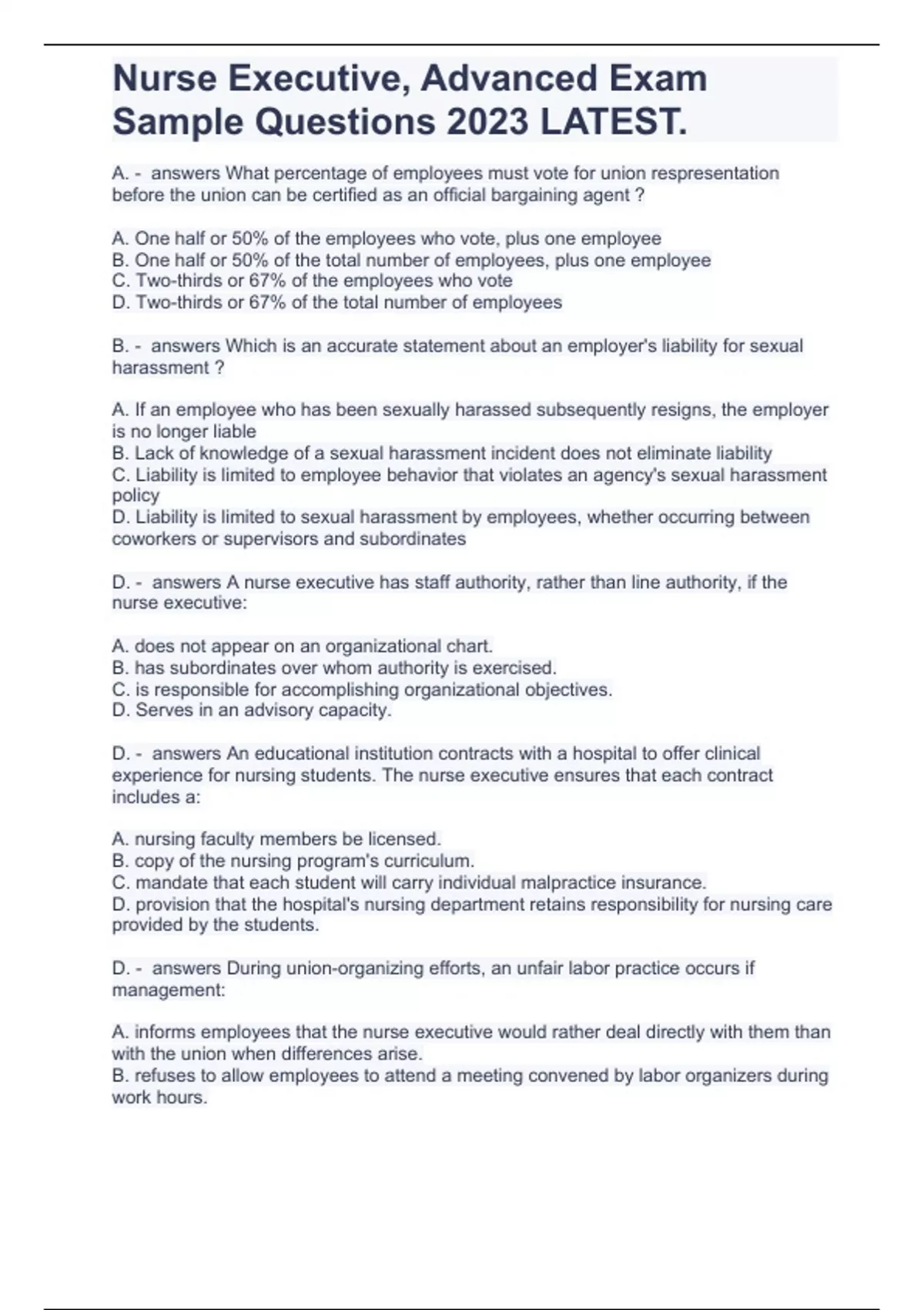 Nurse Executive, Advanced Exam Sample Questions 2023 LATEST.