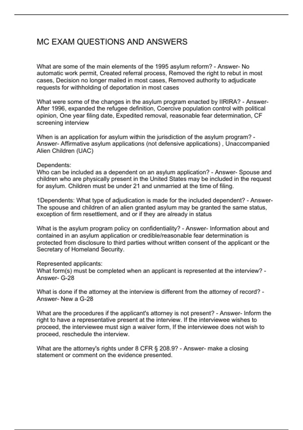 What are some of the main elements of the 1995 asylum reform? - Answer- No automatic work permit, Created referral process, Removed the right to rebut in most cases, Decision no longer mailed in most cases, Removed authority to adjudicate requests for withholding of deportation in most cases What were some of the changes in the asylum program enacted by IIRIRA? - Answer- After 1996, expanded the refugee definition, Coercive population control with political opinion, One year filing date, Expedited removal, reasonable fear determination, CF screening interview When is an application for asylum within the jurisdiction of the asylum program? - Answer- Affirmative asylum applications (not defensive applications) , Unaccompanied Alien Children (UAC) Dependents: Who can be included as a dependent on an asylum application? - Answer- Spouse and children who are physically present in the United States may be included in the request for asylum. Children must be under 21 and unmarried at the time of filing. 1Dependents: What type of adjudication is made for the included dependent? - Answer- The spouse and children of an alien granted asylum may be granted the same status, exception of firm resettlement, and or if they are already in status What is the asylum program policy on confidentiality? - Answer- Information about and contained in an asylum application or credible/reasonable fear determination is protected from disclosure to third parties without written consent of the applicant or the Secretary of Homeland Security. Represented applicants: What form(s) must be completed when an applicant is represented at the interview? - Answer- G-28 What is done if the attorney at the interview is different from the attorney of record? - Answer- New a G-28 What are the procedures if the applicant's attorney is not present? - Answer- Inform the right to have a representative present at the interview. If the interviewee wishes to proceed, the interviewee must sign a waiver form, If the interviewee does not wish to proceed, reschedule the interview.