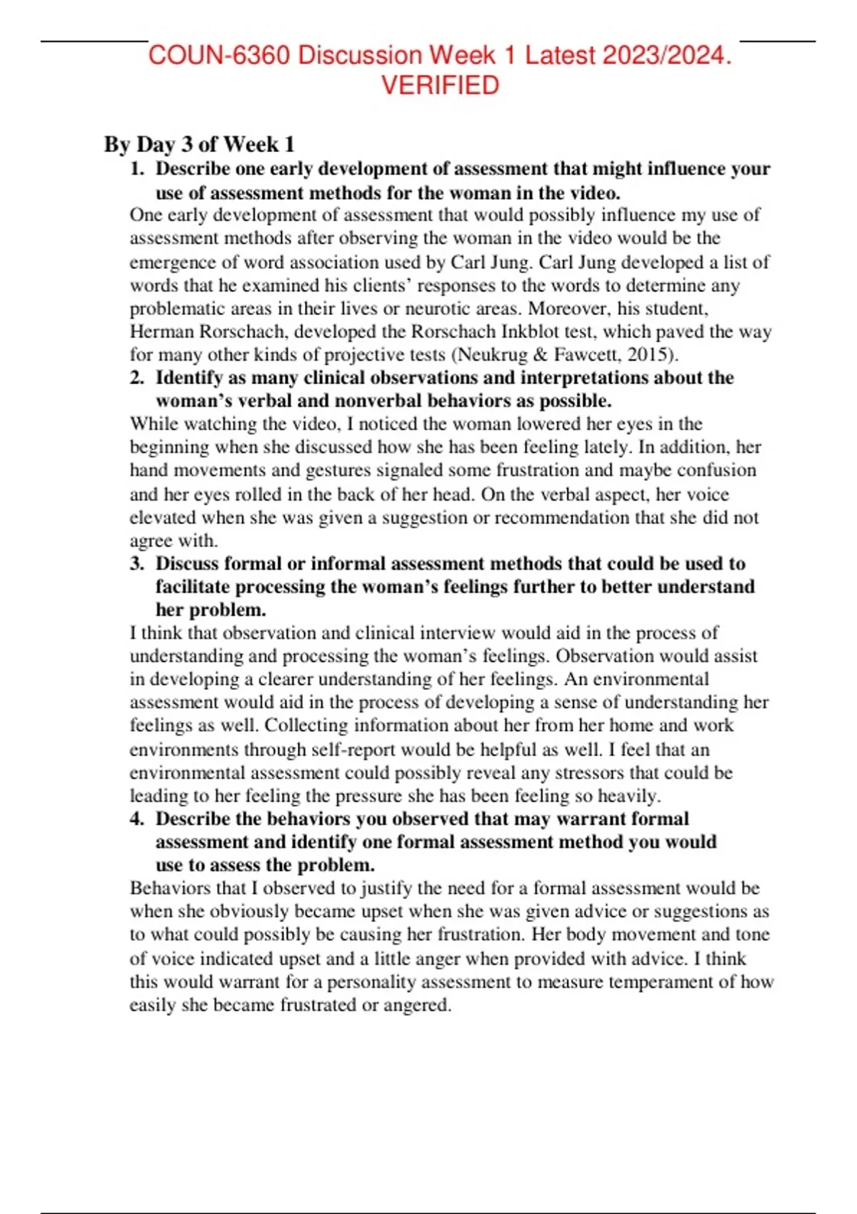 COUN-6360 Discussion Week 1 Latest 2023/2024. VERIFIED By Day 3 of Week 1 1. Describe one early development of assessment that might influence your use of assessment methods for the woman in the video. One early development of assessment that would possibly influence my use of assessment methods after observing the woman in the video would be the emergence of word association used by Carl Jung. Carl Jung developed a list of words that he examined his clients’ responses to the words to determine any problematic areas in their lives or neurotic areas. Moreover, his student, Herman Rorschach, developed the