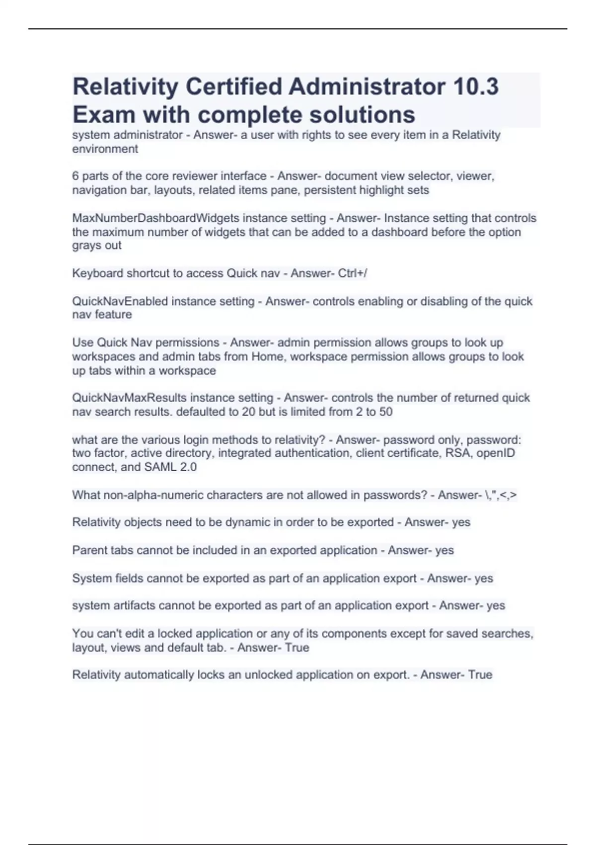 Relativity Certified Administrator 10.3 Exam with complete solutions
