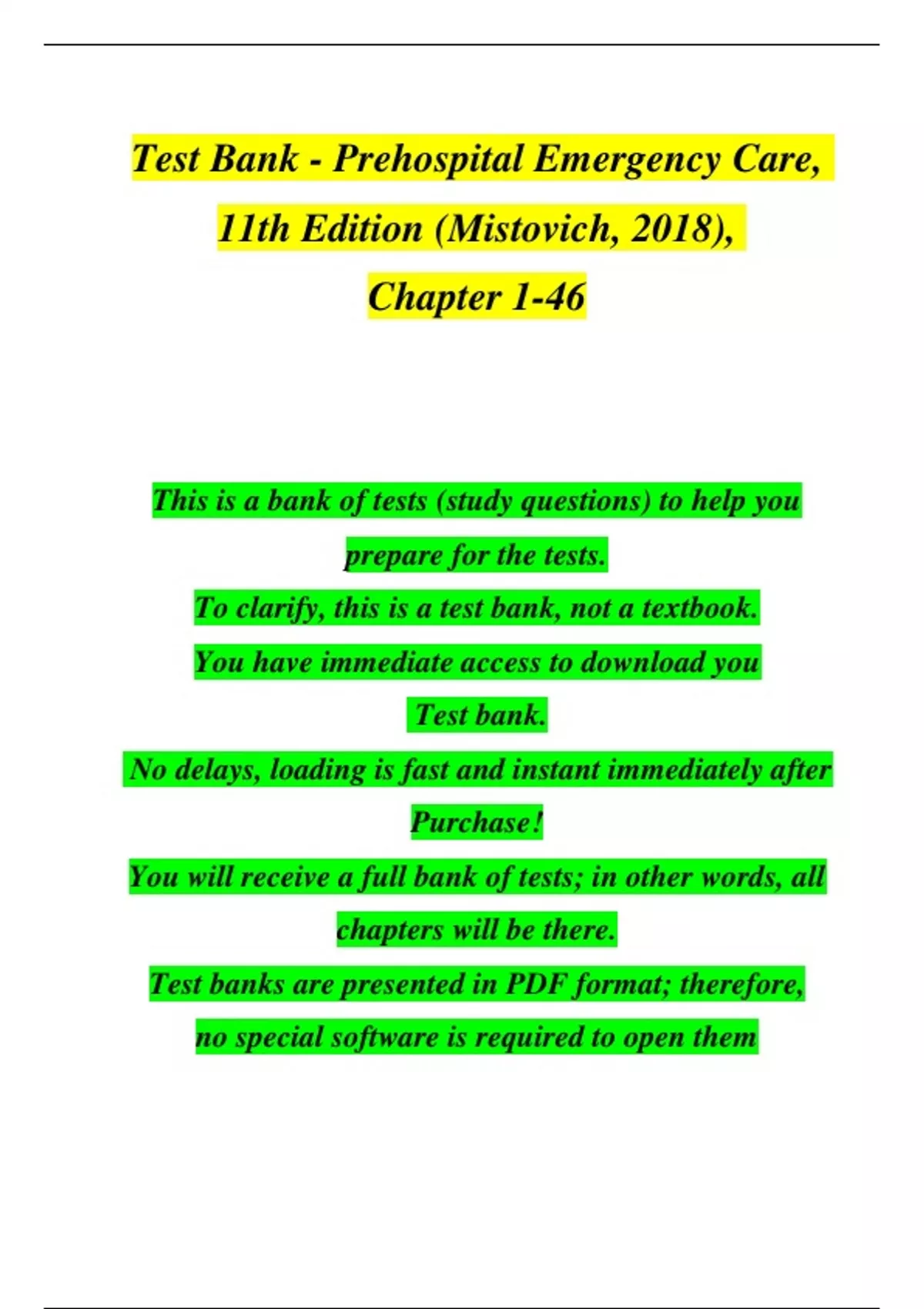 Prehospital Emergency Care, 11th Edition TEST BANK by Joseph J. Mistovich, Keith J. Karren |Complete Chapter 1 - 46| 100 % Verified Prehospital Emergency Care, 11th Edition TEST BANK by Joseph J. Mistovich, Keith J. Karren |Complete Chapter 1 - 46| 100 % Verified