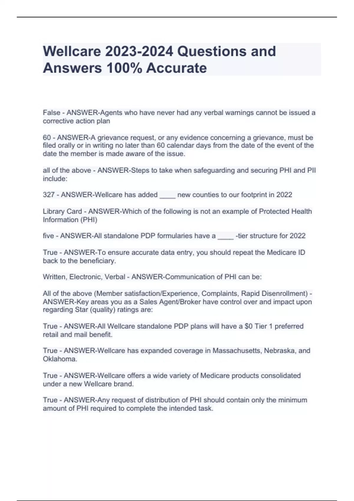 Wellcare Questions and Answers 100% AccurateWellcare Questions and Answers 100% AccurateWellcare Questions and Answers 100% AccurateWellcare Questions and Answers 100% AccurateFalse - ANSWER-Agents who have never had any verbal warnings cannot be issued a corrective action plan 60 - ANSWER-A grievance request, or any evidence concerning a grievance, must be filed orally or in writing no later than 60 calendar days from the date of the event of the date the member is made aware of the issue. all of the above - ANSWER-Steps to take when safeguarding and securing PHI and PII include: