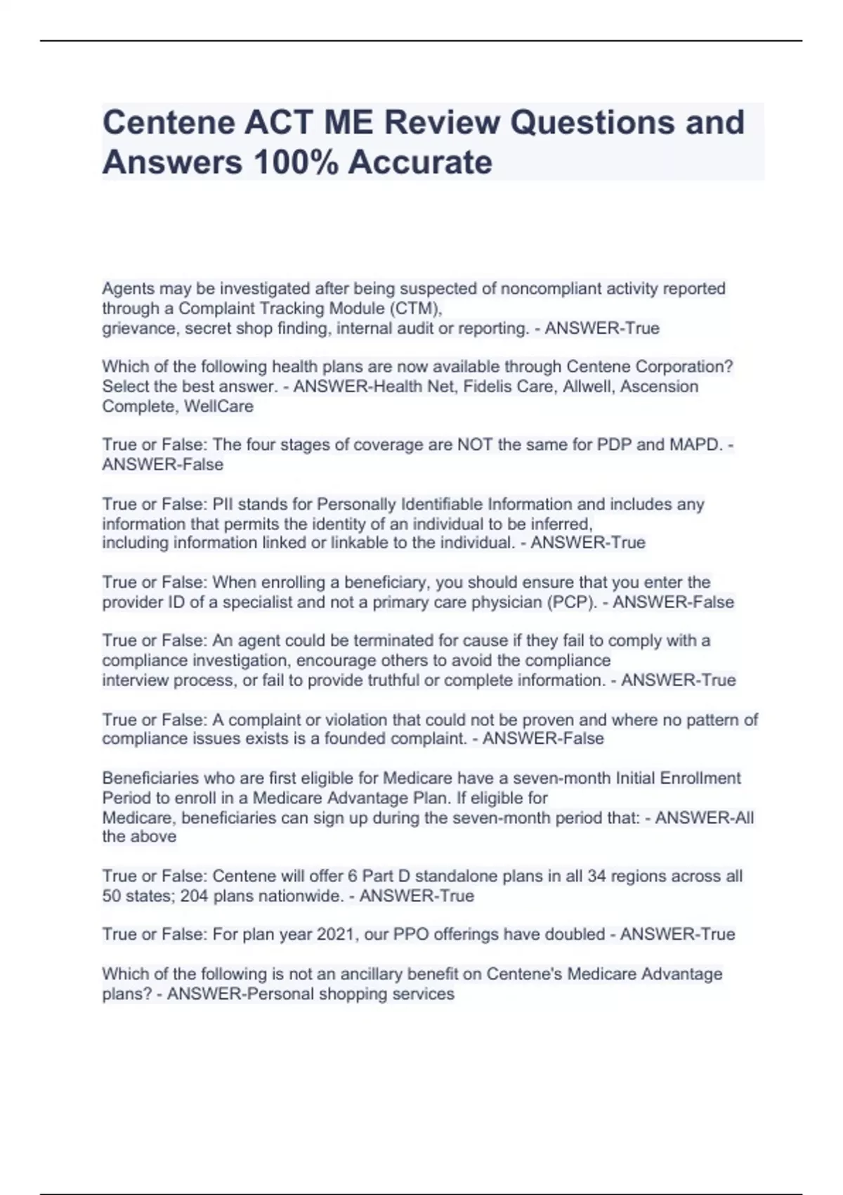 Centene ACT ME Review Questions and Answers 100% AccurateCentene ACT ME Review Questions and Answers 100% AccurateCentene ACT ME Review Questions and Answers 100% Accurate Agents may be investigated after being suspected of noncompliant activity reported through a Complaint Tracking Module (CTM), grievance, secret shop finding, internal audit or reporting. - ANSWER-True Which of the following health plans are now available through Centene Corporation? Select the best answer. - ANSWER-Health Net, Fidelis Care, Allwell, Ascension Complete, WellCare True or False: The four stages of coverage are NOT the same for PDP and MAPD. - ANSWER-False True or False: PII stands for Personally Identifiable Information and includes any information that permits the identity of an individual to be inferred,
