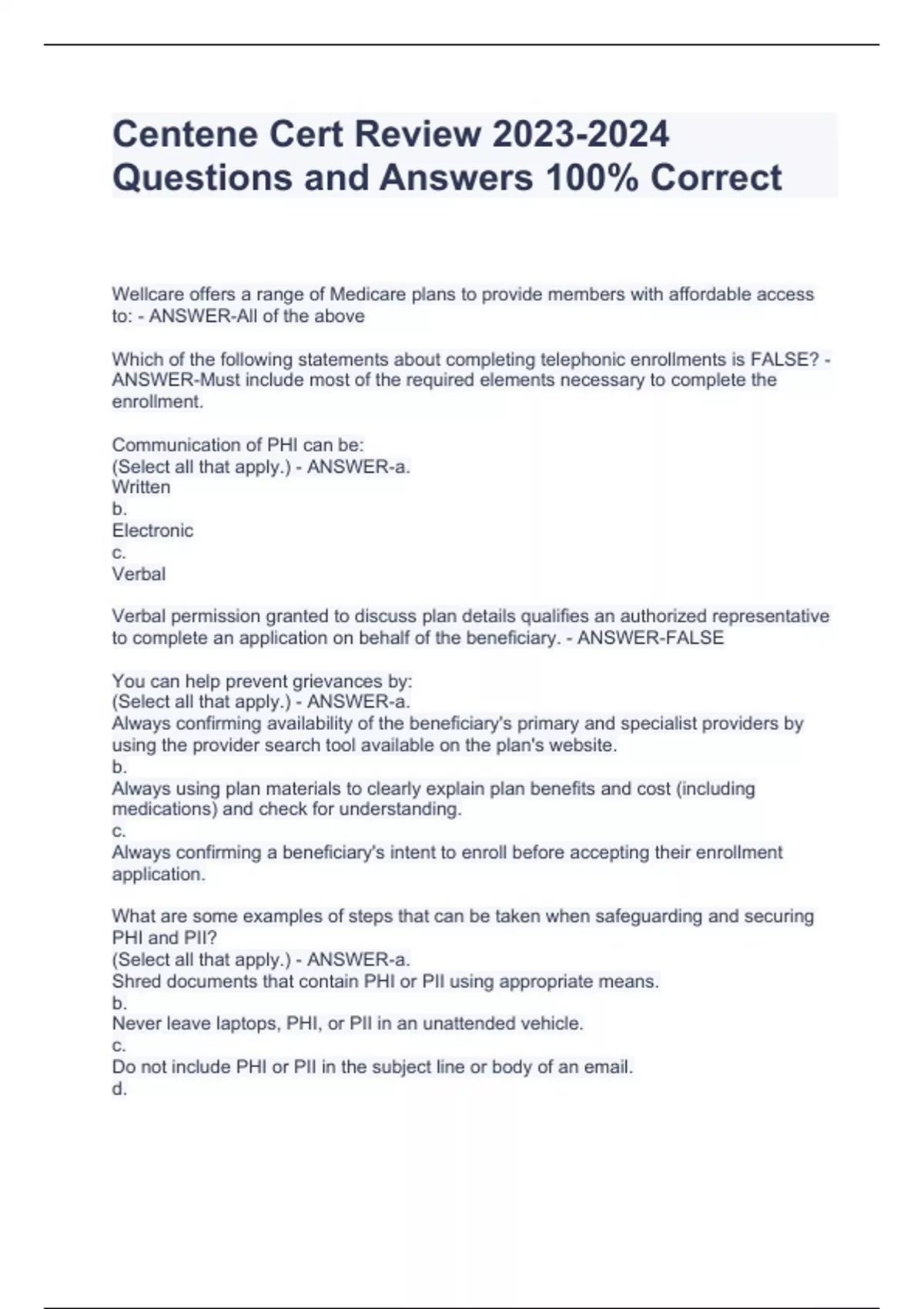Centene Cert Review Questions and Answers 100% Correct Centene Cert Review Questions and Answers 100% Correct Centene Cert Review Questions and Answers 100% Correct Wellcare offers a range of Medicare plans to provide members with affordable access to: - ANSWER-All of the above Which of the following statements about completing telephonic enrollments is FALSE? - ANSWER-Must include most of the required elements necessary to complete the enrollment.