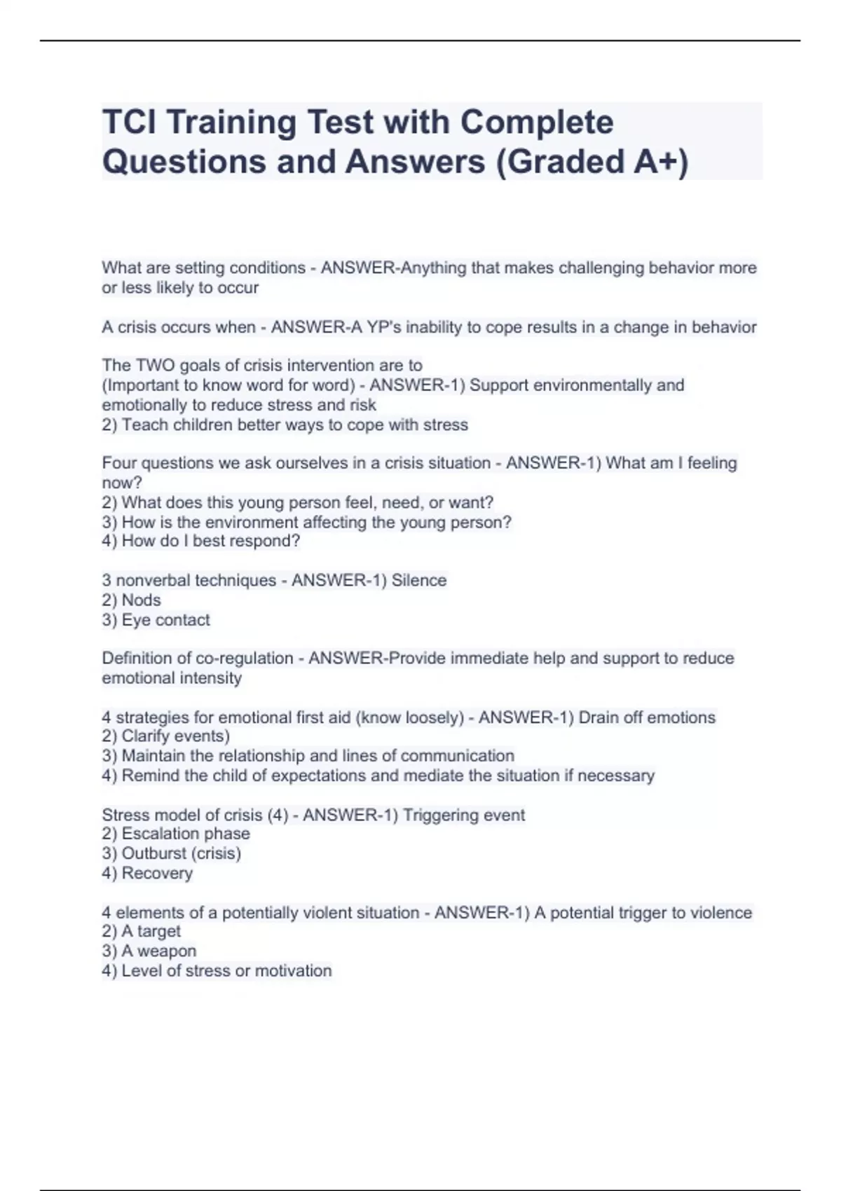 TCI Training Test with Complete Questions and Answers (Graded A+)TCI Training Test with Complete Questions and Answers (Graded A+)TCI Training Test with Complete Questions and Answers (Graded A+) What are setting conditions - ANSWER-Anything that makes challenging behavior more or less likely to occur A crisis occurs when - ANSWER-A YP's inability to cope results in a change in behavior The TWO goals of crisis intervention are to (Important to know word for word) - ANSWER-1) Support environmentally and
