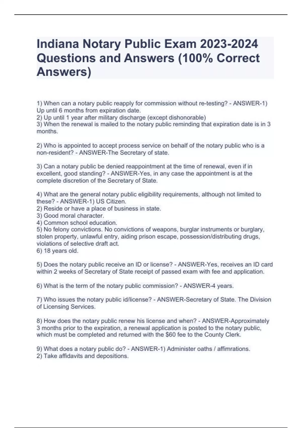 Indiana Notary Public Exam Questions and Answers (100% Correct Answers)Indiana Notary Public Exam Questions and Answers (100% Correct Answers)Indiana Notary Public Exam Questions and Answers (100% Correct Answers)Indiana Notary Public Exam Questions and Answers (100% Correct Answers) 1) When can a notary public reapply for commission without re-testing? - ANSWER-1) Up until 6 months from expiration date. 2) Up until 1 year after military discharge (except dishonorable) 3) When the renewal is mailed to the notary public reminding that expiration date is in 3 months. 2) Who is appointed to accept process service on behalf of the notary public who is a non-resident? - ANSWER-The Secretary of state. 3) Can a notary public be denied reappointment at the time of renewal, even if in excellent, good standing? - ANSWER-Yes, in any case the appointment is at the complete discretion of the Secretary of State.