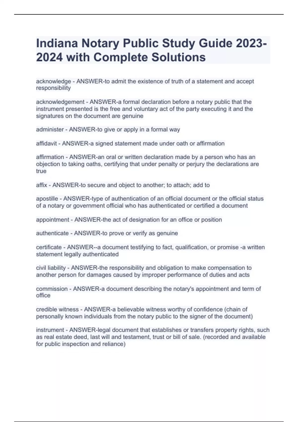 Indiana Notary Public Study Guide with Complete Solutions Indiana Notary Public Study Guide with Complete Solutions Indiana Notary Public Study Guide with Complete Solutions Indiana Notary Public Study Guide with Complete Solutions acknowledge - ANSWER-to admit the existence of truth of a statement and accept responsibility acknowledgement - ANSWER-a formal declaration before a notary public that the instrument presented is the free and voluntary act of the party executing it and the signatures on the document are genuine