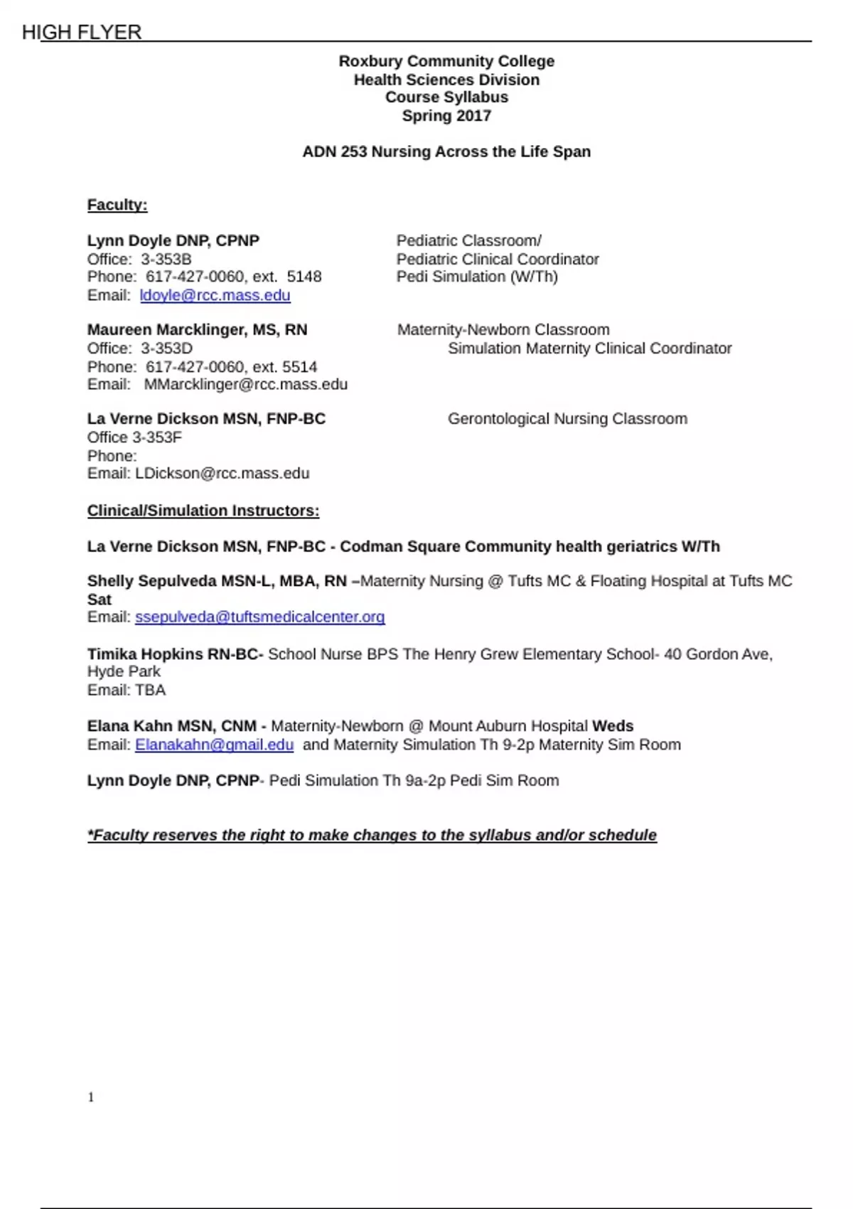 Course Description 10 credits This course builds upon previous nursing courses. Students focus on health promotion, therapeutic nursing interventions, and management of care for groups of clients across the life span. Students provide nursing care to geriatric clients, pediatric clients, and the childbearing family. Students continue to improve critical thinking with the knowledge, skills, and attributes needed for professional nursing practice. This course includes practicum in hospitals, community center, nursing laboratory for simulated clinical and the computer laboratory. Methods of Instruction 1. Critical thinking activities 2. Multimedia: CD-ROM, Video, Tablet/internet-based applications, websites 3. Discussion 4. Lecture 5. Group activities/study groups 6. Written assignments 7. Oral presentations 8. Kaplan resources 9. Lab demonstrations/practice 10. Clinical simulation 11. Demonstration/return demonstration 12. Clinical experience/conferences/practice Methods of Evaluation: 1. Unit exams (3) 64% of grade 2. Final exam 30% of grade 3. Presentation 4% of grade 4. Assigned Quizzes 1% of grade 5. 2 IHI Modules 1% of grade 6. Clinical calculations Pass/Fail (passing grade  90%) (If pass on first time replaces lowest quiz grade) 7. Simulation/Clinical Pass/Fail 8. Kaplan Integrated Tests: Earned points will be added to exam 1 (OB 0-2 pts); exam 2 (Pedi 0-2 pts) and exam 3 Geri 0-2 pts) 60th percentile and higher score: up to a total of 6 total points (2, 2. 2) 50th to 59th percentile score: up to a total of 3 total points (1, 1, 1) 40th to 49th percentile score: up to a total of 1.5 total points (0.5, 0.5, 0.5) Below 40th percentile score: 0 points 3 HIGH FLYER Roxbury Community College Health Sciences Division Course Syllabus SPRING 2017 ADN 253 Nursing Across the Life Span Calculation of Grades and GPA Letter score Range of scores GPA A 94% - 100% 4.0 A- 90% - 93% 3.7 B+ 87% - 89% 3.3 B 84% - 86% 3.0 B- 80% - 83% 2.7 C+ 77% - 79% 2.3 C 74% - 76% 2.0 C- 71% - 73% 1.7 D+ 68% - 70% 1.3 D 65% - 67% 1.0 F 64% and below 0 Theoretical Component The theoretical component of the grade is comprised of a cumulative average on all exams and course work of 77% (C+) or higher as stipulated by the course syllabus. A nursing student who passes didactic but fails clinical and/or lab will have a C recorded as the highest possible course grade. The student will not be allowed to continue to the next semester or to graduation. There is no rounding of grades on quizzes, exams and /or projects in the Nursing Program. Final grades will be determined by the formulas listed in each course syllabus. In order to maintain matriculation in the Nursing Program, all final grades must be 77% (C+) or higher. The course final grade will not be rounded. For example, a final grade of 76.50 will not be rounded to 77. A nursing course may also have additional requirements for passing the course, such as written papers or a clinical calculations exam. (see specific syllabi and policy on Clinical Calculations Competency) (Please refer to Student Handbook located on My RCC for further information r/t evaluation and progression) Attendance Class will begin and end on time. Students are expected to attend all scheduled class times. In respect for fellow students and the learning environment, students are expected to arrive on time. If a student is going to be late, they must enter the class without being disruptive. A student who is absent from class is responsible for any announcements and is responsible to make personal arrangements to assure the acquisition of materials presented. Enrichment sessions will not review basic concepts that were missed by students who did not attend class. Classroom absences may affect the overall grade; in that instructors have consistently observed LD edit 1.19.17 ADN253Spr2017 p4 HIGH FLYER Roxbury Community College Health Sciences Division Course Syllabus SPRING 2017 ADN 253 Nursing Across the Life Span that a pattern of poor class attendance is often correlated with poor exam grades. A student’s trend of poor academic, lab, and clinical performance (tardiness, absence, late exams, and late assignments) are considered cumulative in academic performance. ( RCC Nursing Student Handbook). Attendance will be taken daily for academic trending purposes. Clinical and simulation attendance are mandatory. Students are required to meet their commitment to clinical practice and simulation on ALL assigned days. Refer to the current RCC Nursing Student Handbook for more information. Academic Honesty The policy regarding academic honesty is found in the current RCC Nursing Student Handbook. Please also review Appendix A. Course Communication Students are expected to check their RCC email at least once every weekday as this will be the major method of communication. For problems accessing email, contact IT Dept. Course materials will be available to students on MyRCC, Jenzabar, RCC email, Moodle or any other method faculty deems appropriate. . Disability Accommodations Accommodations for Disabilities: Roxbury Community College is committed to providing all qualified college students equal access to all programs and facilities in accordance with the Americans With Disabilities Act/Amendment Act. Students who have a documented physical, psychological, or learning disability and need academic accommodations must register with the Coordinator of Disability Services, Linda O’Connor. Contact her in Room 3-207C (Academic Building TLC); email ; or phone . Disability Services will provide you with an Accommodation Letter to provide to faculty. Contact your instructor privately to discuss the letter and accommodations required in class. Disability Services will provide you with an Accommodation Letter to provide to faculty. Contact your instructor privately to discuss the letter and accommodations required in class. Honors The Honors Program offers academically talented students a stimulating, challenging,