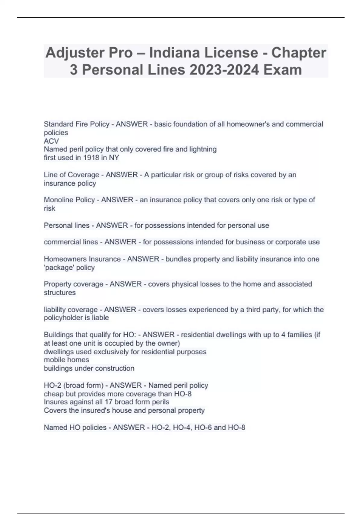 Adjuster Pro – Indiana License - Chapter 3 Personal Lines ExamAdjuster Pro – Indiana License - Chapter 3 Personal Lines ExamAdjuster Pro – Indiana License - Chapter 3 Personal Lines Exam Standard Fire Policy - ANSWER - basic foundation of all homeowner's and commercial policies ACV Named peril policy that only covered fire and lightning first used in 1918 in NY Line of Coverage - ANSWER - A particular risk or group of risks covered by an insurance policy Monoline Policy - ANSWER - an insurance policy that covers only one risk or type of risk Personal lines - ANSWER - for possessions intended for personal use