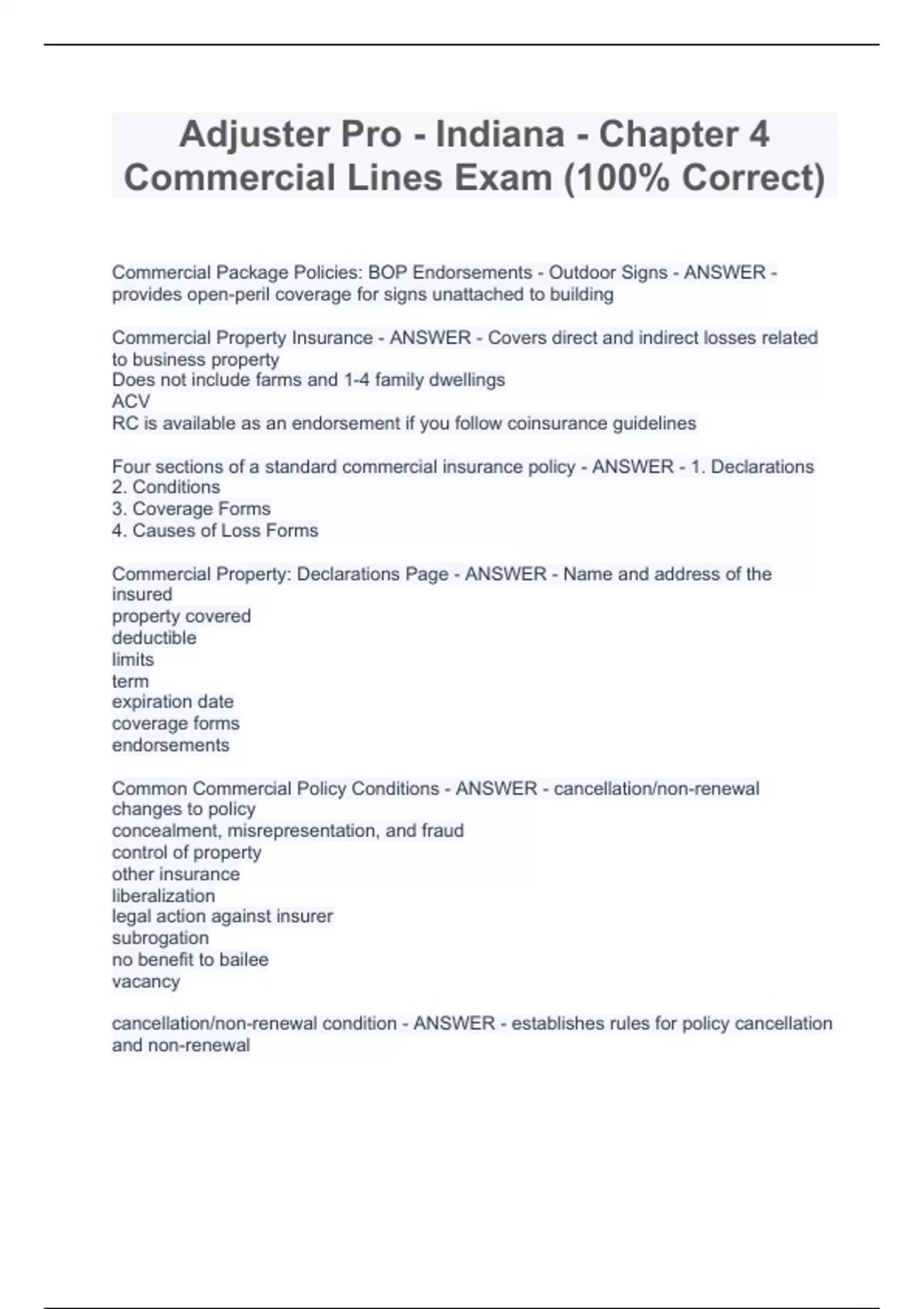 Adjuster Pro - Indiana - Chapter 4 Commercial Lines Exam (100% Correct) Adjuster Pro - Indiana - Chapter 4 Commercial Lines Exam (100% Correct) Adjuster Pro - Indiana - Chapter 4 Commercial Lines Exam (100% Correct) Commercial Package Policies: BOP Endorsements - Outdoor Signs - ANSWER - provides open-peril coverage for signs unattached to building Commercial Property Insurance - ANSWER - Covers direct and indirect losses related to business property Does not include farms and 1-4 family dwellings ACV RC is available as an endorsement if you follow coinsurance guidelines Four sections of a standard commercial insurance policy - ANSWER - 1. Declarations 2. Conditions 3. Coverage Forms