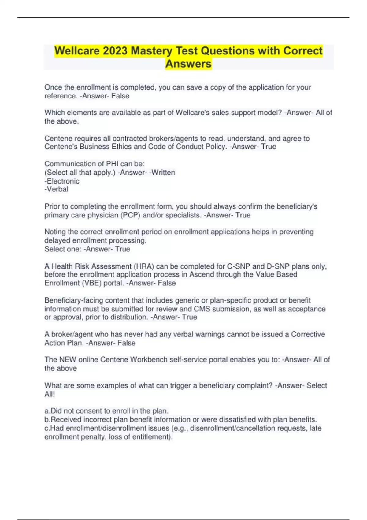 Wellcare 2023 Mastery Test Questions with Correct Answers Once the enrollment is completed, you can save a copy of the application for your reference. -Answer- False Which elements are available as part of Wellcare's sales support model? -Answer- All of the above. Centene requires all contracted brokers/agents to read, understand, and agree to Centene's Business Ethics and Code of Conduct Policy. -Answer- True Communication of PHI can be: (Select all that apply.) -Answer- -Written -Electronic -Verbal Prior to completing the enrollment form, you should always confirm the beneficiary's primary care physician (PCP) and/or specialists. -Answer- True Noting the correct enrollment period on enrollment applications helps in preventing delayed enrollment processing. Select one: -Answer- True A Health Risk Assessment (HRA) can be completed for C-SNP and D-SNP plans only, before the enrollment application process in Ascend through the Value Based Enrollment (VBE) portal. -Answer- False Beneficiary-facing content that includes generic or plan-specific product or benefit information must be submitted for review and CMS submission, as well as acceptance or approval, prior to distribution. -Answer- True A broker/agent who has never had any verbal warnings cannot be issued a Corrective Action Plan. -Answer- False The NEW online Centene Workbench self-service portal enables you to: -Answer- All of the above What are some examples of what can trigger a beneficiary complaint? -Answer- Select All! a.Did not consent to enroll in the plan. b.Received incorrect plan benefit information or were dissatisfied with plan benefits. c.Had enrollment/disenrollment issues (e.g., disenrollment/cancellation requests, late enrollment penalty, loss of entitlement).