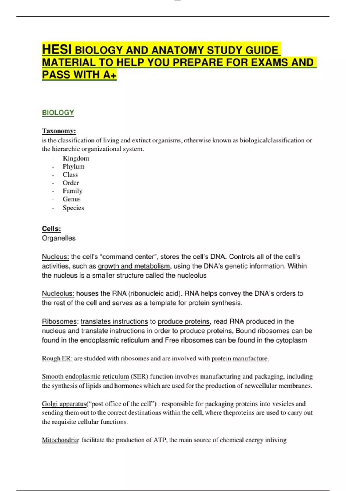 HESI BIOLOGY AND ANATOMY STUDY GUIDE MATERIAL TO HELP YOU PREPARE FOR EXAMS AND PASS WITH A+