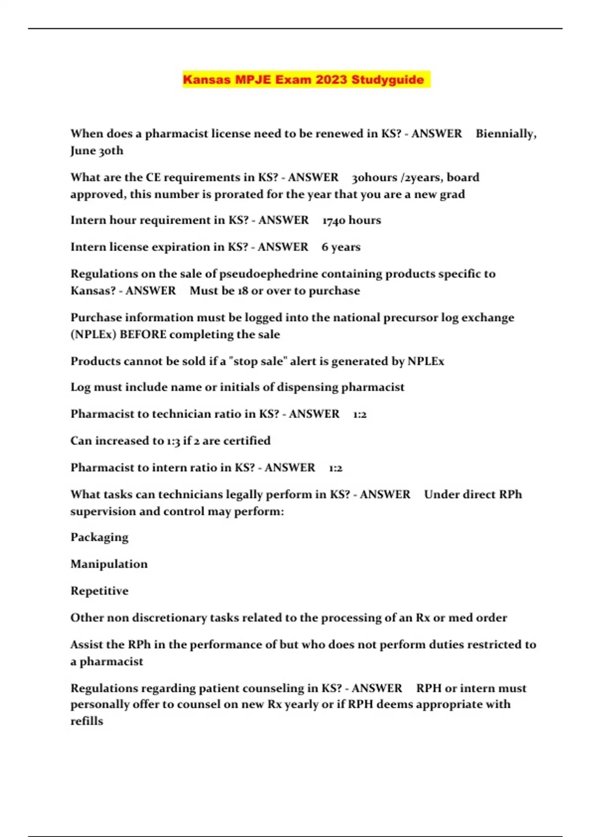 Kansas MPJE Exam 2023 Studyguide When does a pharmacist license need to be renewed in KS? - ANSWER Biennially, June 30th What are the CE requirements in KS? - ANSWER 30hours /2years, board approved, this number is prorated for the year that you are a new grad Intern hour requirement in KS? - ANSWER 1740 hours Intern license expiration in KS? - ANSWER 6 years Regulations on the sale of pseudoephedrine containing products specific to Kansas? - ANSWER Must be 18 or over to purchase Purchase information must be logged into the national precursor log exchange (NPLEx) BEFORE completing the sale Products cannot be sold if a "stop sale" alert is generated by NPLEx Log must include name or initials of dispensing pharmacist Pharmacist to technician ratio in KS? - ANSWER 1:2 Can increased to 1:3 if 2 are certified Pharmacist to intern ratio in KS? - ANSWER 1:2 What tasks can technicians legally perform in KS? - ANSWER Under direct RPh supervision and control may perform: Packaging Manipulation Repetitive Other non discretionary tasks related to the processing of an Rx or med order Assist the RPh in the performance of but who does not perform duties restricted to a pharmacist Regulations regarding patient counseling in KS? - ANSWER RPH or intern must personally offer to counsel on new Rx yearly or if RPH deems appropriate with refills Verbal counseling must be in person or on the phone Additional pt information may supplement verbal counseling HOWEVER it is not a substitute RPH or intern must notify pt if a brand has been substituted for generic RPH does not need to provide counseling if patient refuses PRH does not need to counsel if it may be detrimental to patients care or pt/prescriber relationship Size, design, layout, security features or formatting requirements for Rx pads in KS? - ANSWER Blank forms for written Rx can have 2 signature lines, 1 must say DAW and the other "brand exchange permissible" Controlled Rx (II-V) can't be issued on Rx blank that is preprinted with drug name, strength, quantity, or directions How long is a non-controlled Rx valid in KS? - ANSWER One year from the date of issue