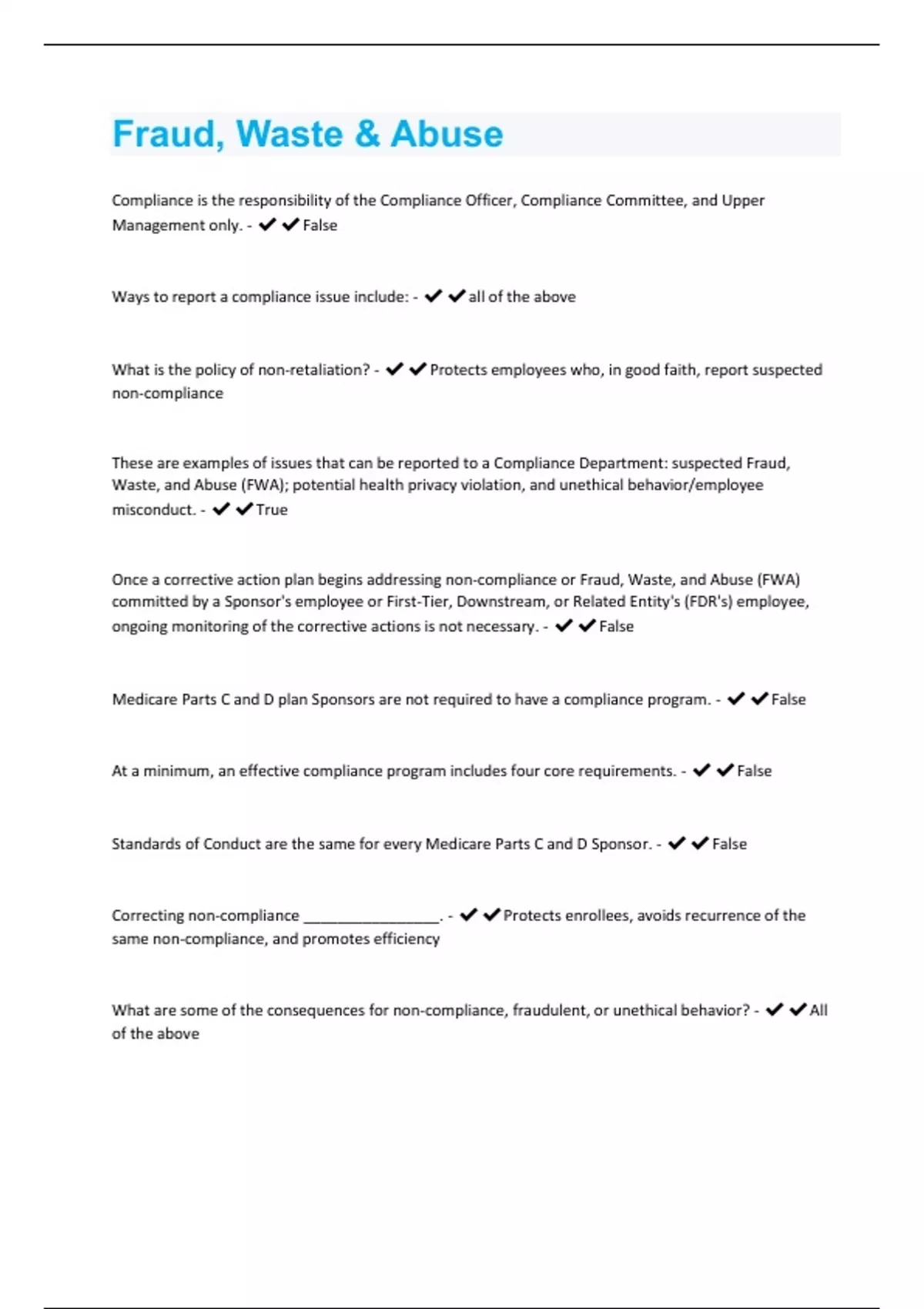 Compliance is the responsibility of the Compliance Officer, Compliance Committee, and Upper Management only. - False Ways to report a compliance issue include: - all of the above What is the policy of non-retaliation? - Protects employees who, in good faith, report suspected non-compliance These are examples of issues that can be reported to a Compliance Department: suspected Fraud, Waste, and Abuse (FWA); potential health privacy violation, and unethical behavior/employee misconduct. - True Once a corrective action plan begins addressing non-compliance or Fraud, Waste, and Abuse (FWA) committed by a Sponsor's employee or First-Tier, Downstream, or Related Entity's (FDR's) employee, ongoing monitoring of the corrective actions is not necessary. - False Medicare Parts C and D plan Sponsors are not required to have a compliance program. - False At a minimum, an effective compliance program includes four core requirements. - False Standards of Conduct are the same for every Medicare Parts C and D Sponsor. - False Correcting non-compliance ________________. - Protects enrollees, avoids recurrence of the same non-compliance, and promotes efficiency What are some of the consequences for non-compliance, fraudulent, or unethical behavior? - All of the aboveOnce a corrective action plan is started, the corrective actions must be monitored annually to ensure they are effective. - False