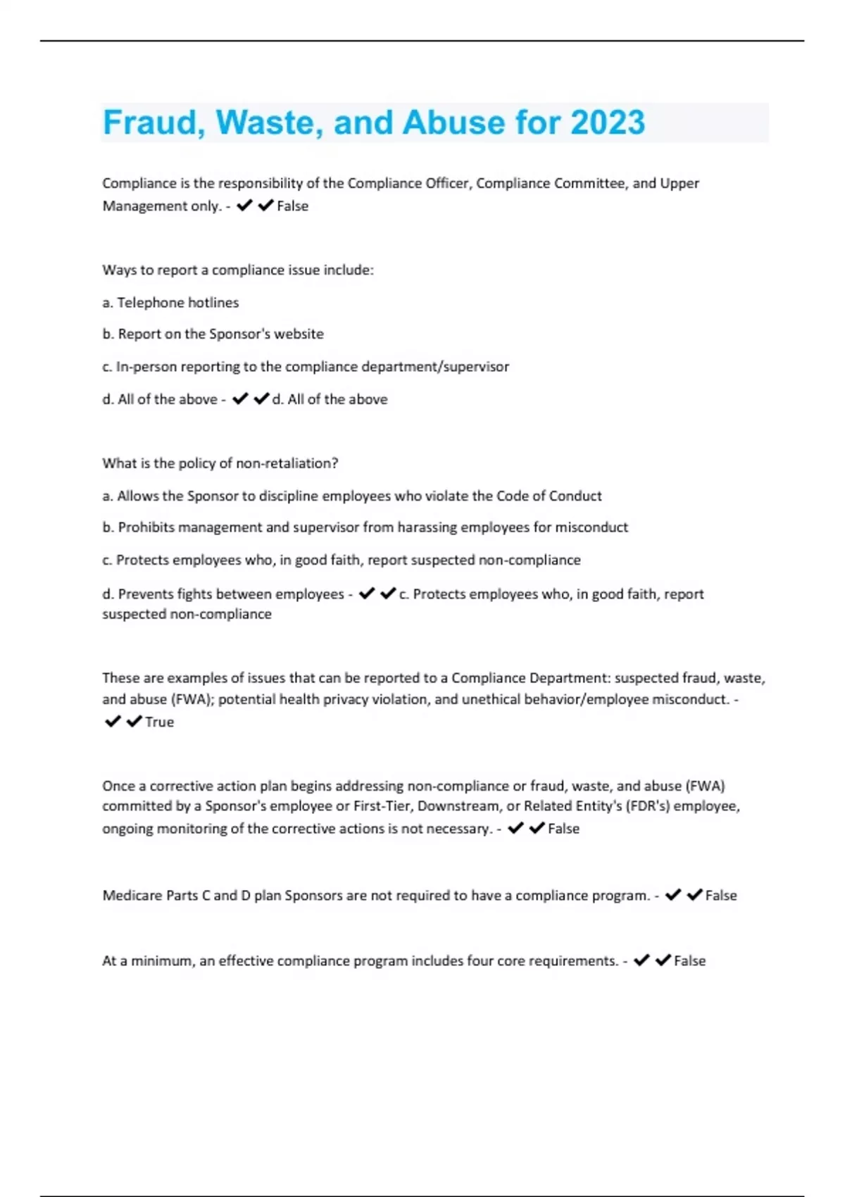 Compliance is the responsibility of the Compliance Officer, Compliance Committee, and Upper Management only. - False Ways to report a compliance issue include: a. Telephone hotlines b. Report on the Sponsor's website c. In-person reporting to the compliance department/supervisor d. All of the above - d. All of the above What is the policy of non-retaliation? a. Allows the Sponsor to discipline employees who violate the Code of Conduct b. Prohibits management and supervisor from harassing employees for misconduct c. Protects employees who, in good faith, report suspected non-compliance d. Prevents fights between employees - c. Protects employees who, in good faith, report suspected non-compliance These are examples of issues that can be reported to a Compliance Department: suspected fraud, waste, and abuse (FWA); potential health privacy violation, and unethical behavior/employee misconduct. - True Once a corrective action plan begins addressing non-compliance or fraud, waste, and abuse (FWA) committed by a Sponsor's employee or First-Tier, Downstream, or Related Entity's (FDR's) employee, ongoing monitoring of the corrective actions is not necessary. - False Medicare Parts C and D plan Sponsors are not required to have a compliance program. - False At a minimum, an effective compliance program includes four core requirements. - FalseStandards of Conduct are the same for every Medicare Parts C and D Sponsor. - False Correcting non-compliance ________________. a. Protects enrollees, avoids recurrence of the same non-compliance, and promotes efficiency b. Ensures bonuses for all employees c. Both A and B - a. Protects enrollees, avoids recurrence of the same non-compliance, and promotes efficiency What are some of the consequences for non-compliance, fraudulent, or unethical behavior? a. Disciplinary action b. Termination of employment c. Exclusion from participation in all federal health care programs d. All of the above - d. All of the above
