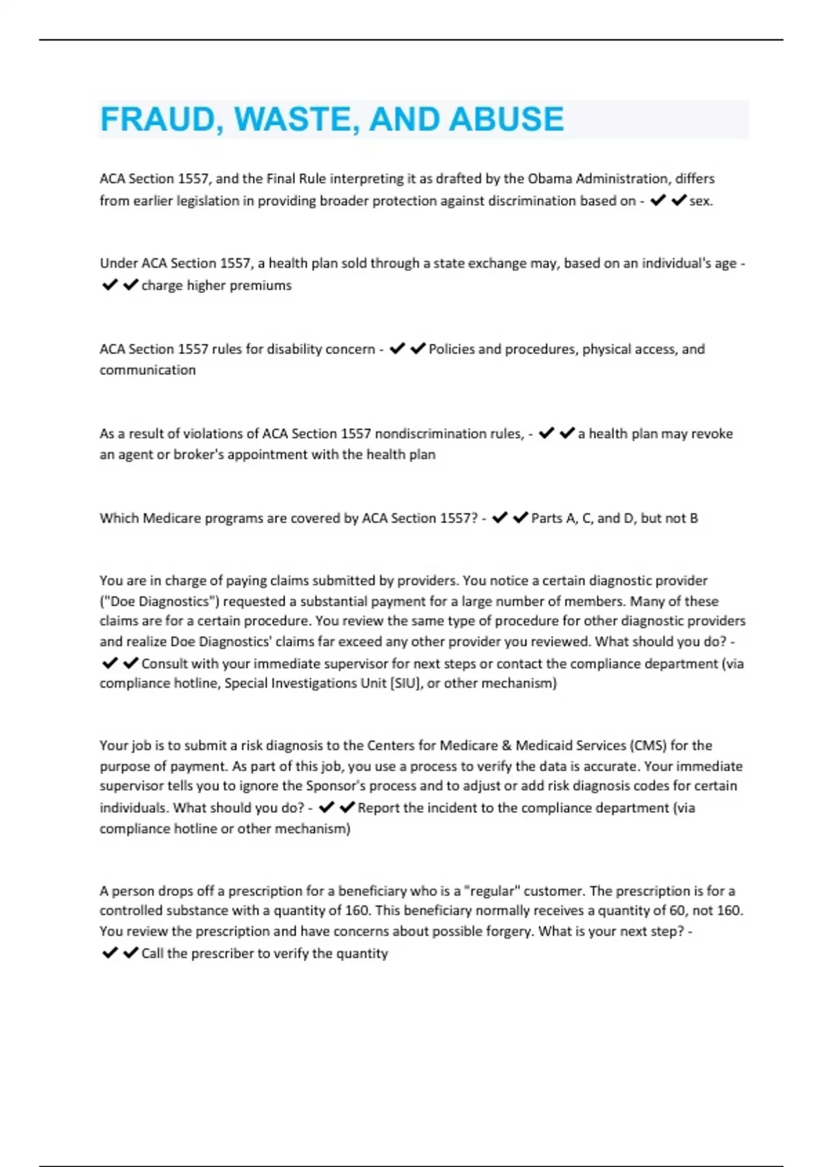 ACA Section 1557, and the Final Rule interpreting it as drafted by the Obama Administration, differs from earlier legislation in providing broader protection against discrimination based on - sex. Under ACA Section 1557, a health plan sold through a state exchange may, based on an individual's age - charge higher premiums ACA Section 1557 rules for disability concern - Policies and procedures, physical access, and communication As a result of violations of ACA Section 1557 nondiscrimination rules, - a health plan may revoke an agent or broker's appointment with the health plan Which Medicare programs are covered by ACA Section 1557? - Parts A, C, and D, but not B You are in charge of paying claims submitted by providers. You notice a certain diagnostic provider ("Doe Diagnostics") requested a substantial payment for a large number of members. Many of these claims are for a certain procedure. You review the same type of procedure for other diagnostic providers and realize Doe Diagnostics' claims far exceed any other provider you reviewed. What should you do? - Consult with your immediate supervisor for next steps or contact the compliance department (via compliance hotline, Special Investigations Unit [SIU], or other mechanism) Your job is to submit a risk diagnosis to the Centers for Medicare & Medicaid Services (CMS) for the purpose of payment. As part of this job, you use a process to verify the data is accurate. Your immediate supervisor tells you to ignore the Sponsor's process and to adjust or add risk diagnosis codes for certain individuals. What should you do? - Report the incident to the compliance department (via compliance hotline or other mechanism) A person drops off a prescription for a beneficiary who is a "regular" customer. The prescription is for a controlled substance with a quantity of 160. This beneficiary normally receives a quantity of 60, not 160. You review the prescription and have concerns about possible forgery. What is your next step? - Call the prescriber to verify the quantityWhich of the following requires intent to obtain payment and the knowledge the actions are wrong? - Fraud Which of the following is NOT potentially a penalty for violation of a law or regulation prohibiting fraud, waste, and abuse (FWA)? - Deportation You are performing a regular inventory of the controlled substances in the pharmacy. You discover a minor inventory discrepancy. What should you do? - Discuss your concerns with your supervis