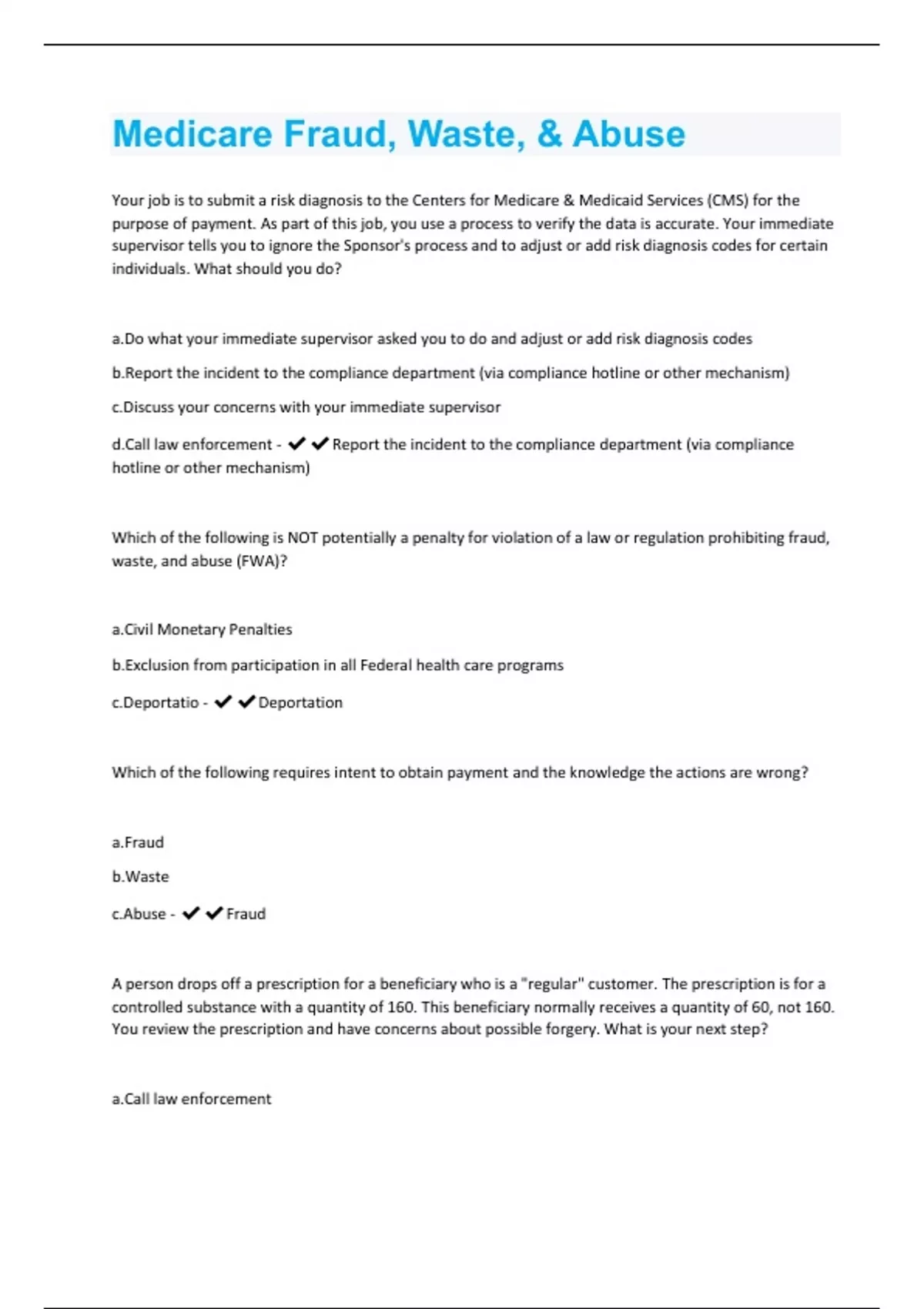 Your job is to submit a risk diagnosis to the Centers for Medicare & Medicaid Services (CMS) for the purpose of payment. As part of this job, you use a process to verify the data is accurate. Your immediate supervisor tells you to ignore the Sponsor's process and to adjust or add risk diagnosis codes for certain individuals. What should you do? a.Do what your immediate supervisor asked you to do and adjust or add risk diagnosis codes b.Report the incident to the compliance department (via compliance hotline or other mechanism) c.Discuss your concerns with your immediate supervisor d.Call law enforcement - Report the incident to the compliance department (via compliance hotline or other mechanism) Which of the following is NOT potentially a penalty for violation of a law or regulation prohibiting fraud, waste, and abuse (FWA)? a.Civil Monetary Penalties b.Exclusion from participation in all Federal health care programs c.Deportatio - Deportation Which of the following requires intent to obtain payment and the knowledge the actions are wrong? a.Fraud b.Waste c.Abuse - Fraud A person drops off a prescription for a beneficiary who is a "regular" customer. The prescription is for a controlled substance with a quantity of 160. This beneficiary normally receives a quantity of 60, not 160. You review the prescription and have concerns about possible forgery. What is your next step? a.Call law enforcementb.Call the prescriber to verify the quantity c.Call the Sponsor's compliance department d.Fill the prescription for 160 e.Fill the prescription for 60 - Call the prescriber to verify the quantity