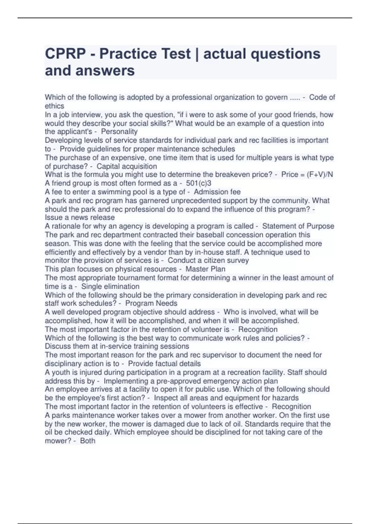 CPRP - Practice Test | actual questions and answers Which of the following is adopted by a professional organization to govern ..... - Code of ethics In a job interview, you ask the question, "if i were to ask some of your good friends, how would they describe your social skills?" What would be an example of a question into the applicant's - Personality Developing levels of service standards for individual park and rec facilities is important to - Provide guidelines for proper maintenance schedules The purchase of an expensive, one time item that is used for multiple years is what type of purchase? - Capital acquisition What is the formula you might use to determine the breakeven price? - Price = (F+V)/N A friend group is most often formed as a - 501(c)3 A fee to enter a swimming pool is a type of - Admission fee A park and rec program has garnered unprecedented support by the community. What should the park and rec professional do to expand the influence of this program? - Issue a news release A rationale for why an agency is developing a program is called - Statement of Purpose The park and rec department contracted their baseball concession operation this season. This was done with the feeling that the service could be accomplished more efficiently and effectively by a vendor than by in-house staff. A technique used to monitor the provision of services is - Conduct a citizen survey This plan focuses on physical resources - Master Plan The most appropriate tournament format for determining a winner in the least amount of time is a - Single elimination Which of the following should be the primary consideration in developing park and rec staff work schedules? - Program Needs A well developed program objective should address - Who is involved, what will be accomplished, how it will be accomplished, and when it will be accomplished. The most important factor in the retention of volunteer is - Recognition Which of the following is the best way to communicate work rules and policies? - Discuss them at in-service training sessions The most important reason for the park and rec supervisor to document the need for disciplinary action is to - Provide factual details A youth is injured during participation in a program at a recreation facility. Staff should address this by - Implementing a pre-approved emergency action plan An employee arrives at a facility to open it for public use. Which of the following should be the employee's first action? - Inspect all areas and equipment for hazards The most important factor in the retention of volunteers is effective - Recognition A parks maintenance worker takes over a mower from another worker. On the first use by the new worker, the mower is damaged due to lack of oil. Standards require that the oil be checked daily. Which employee should be disciplined for not taking care of the mower? - Both Before procuring equipment and supplies for programs, the park and rec should - Conduct an inventory of current assets and their condition The primary goal of community park and rec services for individuals with disabilities is to - Make life satisfying and meaningful for participants There is a communication gap among an agency's staff. When planning new types of programs and events, and evaluating operations and procedures, the director realizes her executive staff, coordinators and supervisors are not on the same page at all. To correct this problem, it is imperative the director clearly communicates the - Agencies goals, priorities, and strategic plan A park and rec agency is not required to make all facilities accessible as long as programs offered in inaccessible facilities - Are available in alternative accessible facilities As posted, a park closes at 10pm. An adult enters the park at midnight and remains undetected. What duty of care is owed to this individual? - Provide warnings of hazards A rec professional should develop a _____ to determine the total amount of activity funding needed - Program budget Development of a capital improvement program focuses on which of the following? - Expected future costs