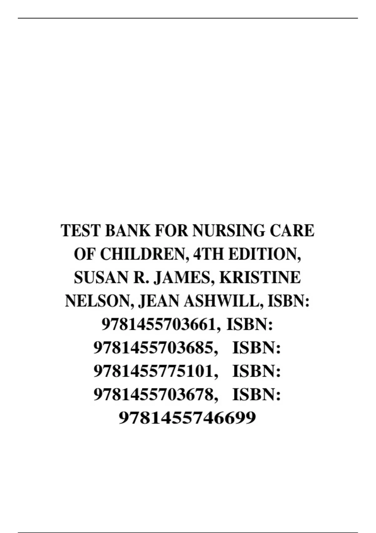 TEST BANK FOR NURSING CARE OF CHILDREN, 4TH EDITION, SUSAN R. JAMES, KRISTINE NELSON, JEAN ASHWILL, ISBN: 9781455703661, ISBN: 9781455703685, ISBN: 9781455775101, ISBN: 9781455703678, ISBN: 9781455746699