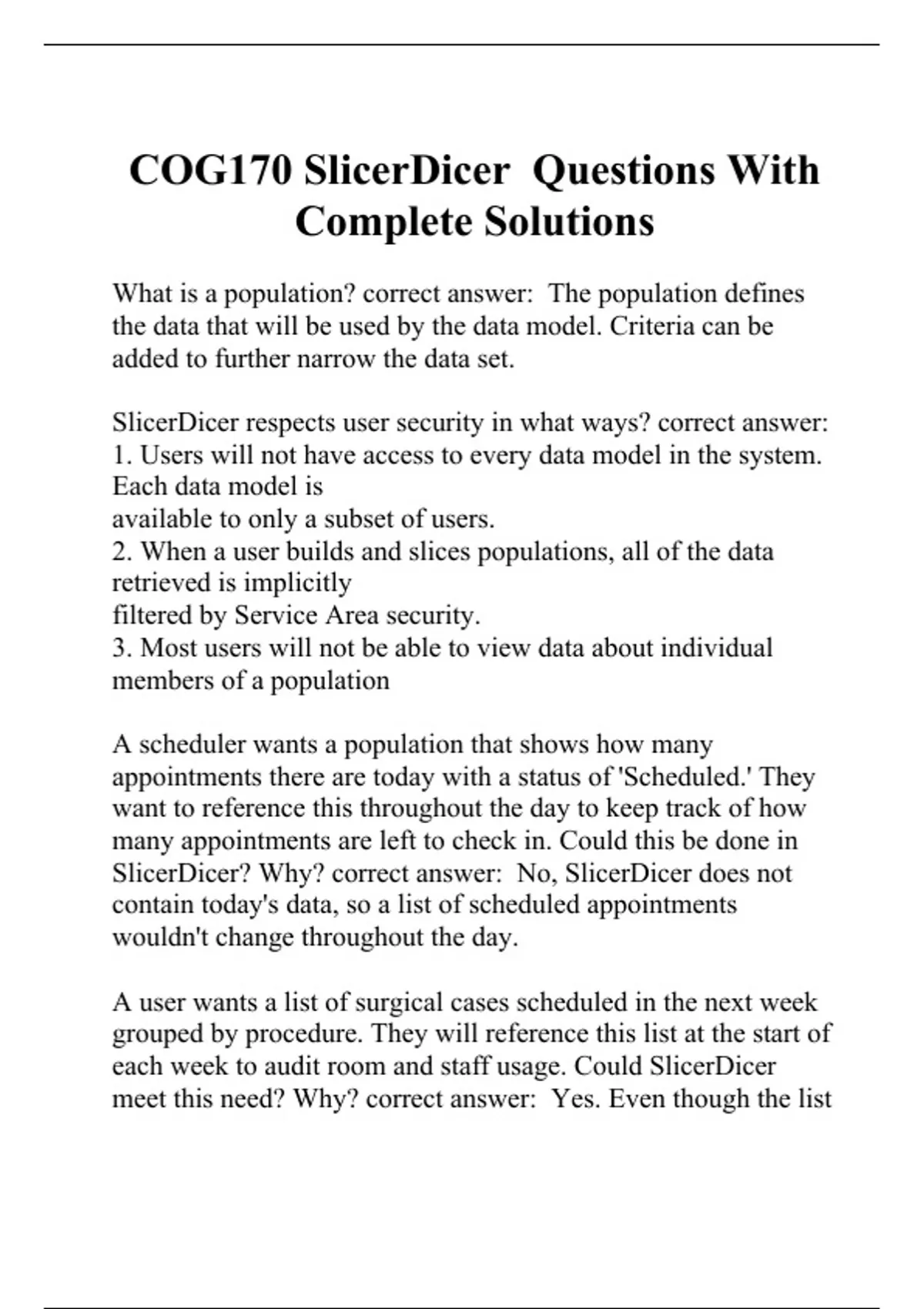 What is a population? correct answer: The population defines the data that will be used by the data model. Criteria can be added to further narrow the data set. SlicerDicer respects user security in what ways? correct answer: 1. Users will not have access to every data model in the system. Each data model is available to only a subset of users. 2. When a user builds and slices populations, all of the data retrieved is implicitly filtered by Service Area security. 3. Most users will not be able to view data about individual members of a population A scheduler wants a population that shows how many appointments there are today with a status of 'Scheduled.' They want to reference this throughout the day to keep track of how many appointments are left to check in. Could this be done in SlicerDicer? Why? correct answer: No, SlicerDicer does not contain today's data, so a list of scheduled appointments wouldn't change throughout the day. A user wants a list of surgical cases scheduled in the next week grouped by procedure. They will reference this list at the start of each week to audit room and staff usage. Could SlicerDicer meet this need? Why? correct answer: Yes. Even though the list has to include future cases, these cases were scheduled in advance, and all such surgeries scheduled at least a day earlier will be displayed. True or False: SlicerDicer sessions are the best option for KPI (key performance indicators). correct answer: No KPIs ﴾Key Performance Indicators﴿ need to be standardized for all consumers. Since SlicerDicer is designed to let every user adjust and manipulate their visualization of the underlying data, it is not ideal for this type of report. Instead, we use Dashboard Metrics as our primary tool for distributing KPIs to consumers. Data Model correct answer: One SlicerDicer Data Model consists of a set of data that has been curated with a pre‐built set of available filters. Epic releases many data models, but an organization can create their own unique data models as well. SlicerDicer respects user security in several ways: correct answer: 1. Users will not have access to every data model in the system. Each data model is available to only a subset of users. 2. When a user builds and slices populations, all of the data retrieved is implicitly filtered by Service Area security. 3. Most users will not be able to view data about individual members of a population. SlicerDicer and large data sets correct answer: SlicerDicer retrieves its data from the Caboodle database. This means it can filter and display large data sets without affecting your production database, Chronicles. With the ability to modify your date range and aggregate over weeks, months, or even years, SlicerDicer can be the primary resource for discerning long‐term trends across your organization. SlicerDicer and small data sets correct answer: SlicerDicer can also be a powerful tool for following up on specific, small sets