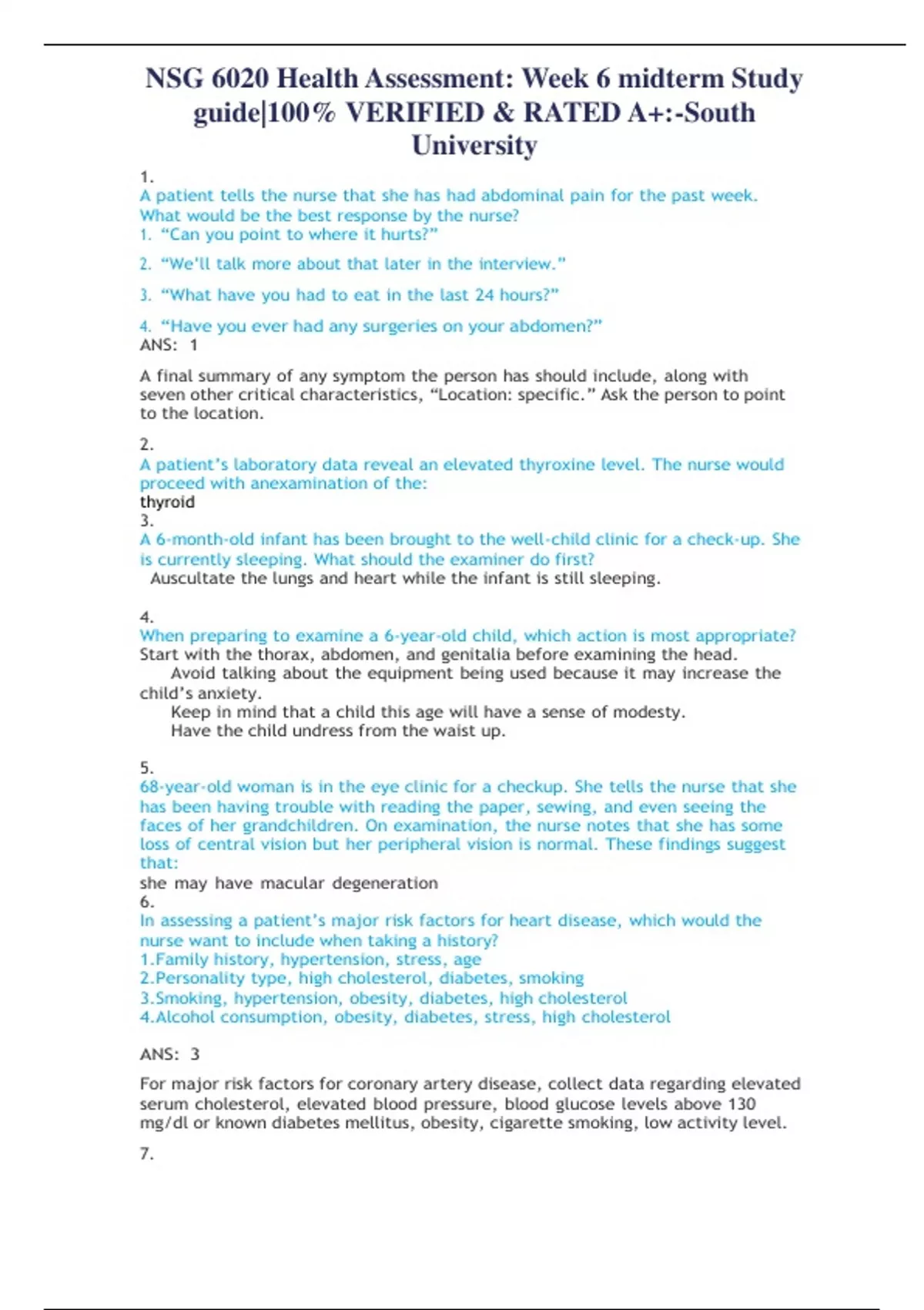 A patient tells the nurse that she has had abdominal pain for the past week. What would be the best response by the nurse? 1. “Can you point to where it hurts?” 2. “We’ll talk more about that later in the interview.” 3. “What have you had to eat in the last 24 hours?” 4. “Have you ever had any surgeries on your abdomen?” ANS: 1 A final summary of any symptom the person has should include, along with seven other critical characteristics, “Location: specific.” Ask the person to point to the location. 2. A patient’s laboratory data reveal an elevated thyroxine level. The nurse would proceed with anexamination of the: thyroid 3. A 6-month-old infant has been brought to the well-child clinic for a check-up. She is currently sleeping. What should the examiner do first? Auscultate the lungs and heart while the infant is still sleeping. 4. When preparing to examine a 6-year-old child, which action is most appropriate? Start with the thorax, abdomen, and genitalia before examining the head. Avoid talking about the equipment being used because it may increase the child’s anxiety. Keep in mind that a child this age will have a sense of modesty. Have the child undress from the waist up. 5. 68-year-old woman is in the eye clinic for a checkup. She tells the nurse that she has been having trouble with reading the paper, sewing, and even seeing the faces of her grandchildren. On examination, the nurse notes that she has some loss of central vision but her peripheral vision is normal. These findings suggest that: she may have macular degeneration 6. In assessing a patient’s major risk factors for heart disease, which would the nurse want to include when taking a history? 1.Family history, hypertension, stress, age 2.Personality type, high cholesterol, diabetes, smoking 3.Smoking, hypertension, obesity, diabetes, high cholesterol 4.Alcohol consumption, obesity, diabetes, stress, high cholesterol ANS: 3 For major risk factors for coronary artery disease, collect data regarding elevated serum cholesterol, elevated blood pressure, blood glucose levels above 130 mg/dl or known diabetes mellitus, obesity, cigarette smoking, low activity level. 7. A teenage patient comes to the emergency department with complaints of an inability to breathe and a sharp pain in the left side of his chest. The assessment findings include cyanosis, tachypnea, tracheal deviation to the right, decreased tactile fremitus on the left, hyperresonance on the left, and decreased breath sounds on the left. The nurse interprets that these assessment findings are consistent with: B) a pneumothorax. 8. During a hearing assessment the nurse practitioner finds that sound lateralizes to the patient’s left ear with the Weber test. What can the nurse practitioner conclude from this? The patient has a conductive hearing loss in the right ear. Lateralization is a normal finding with the Weber test. The patient could have either a sensorineural or a conductive loss. A mistake has occurred; the test must be repeated. 9.