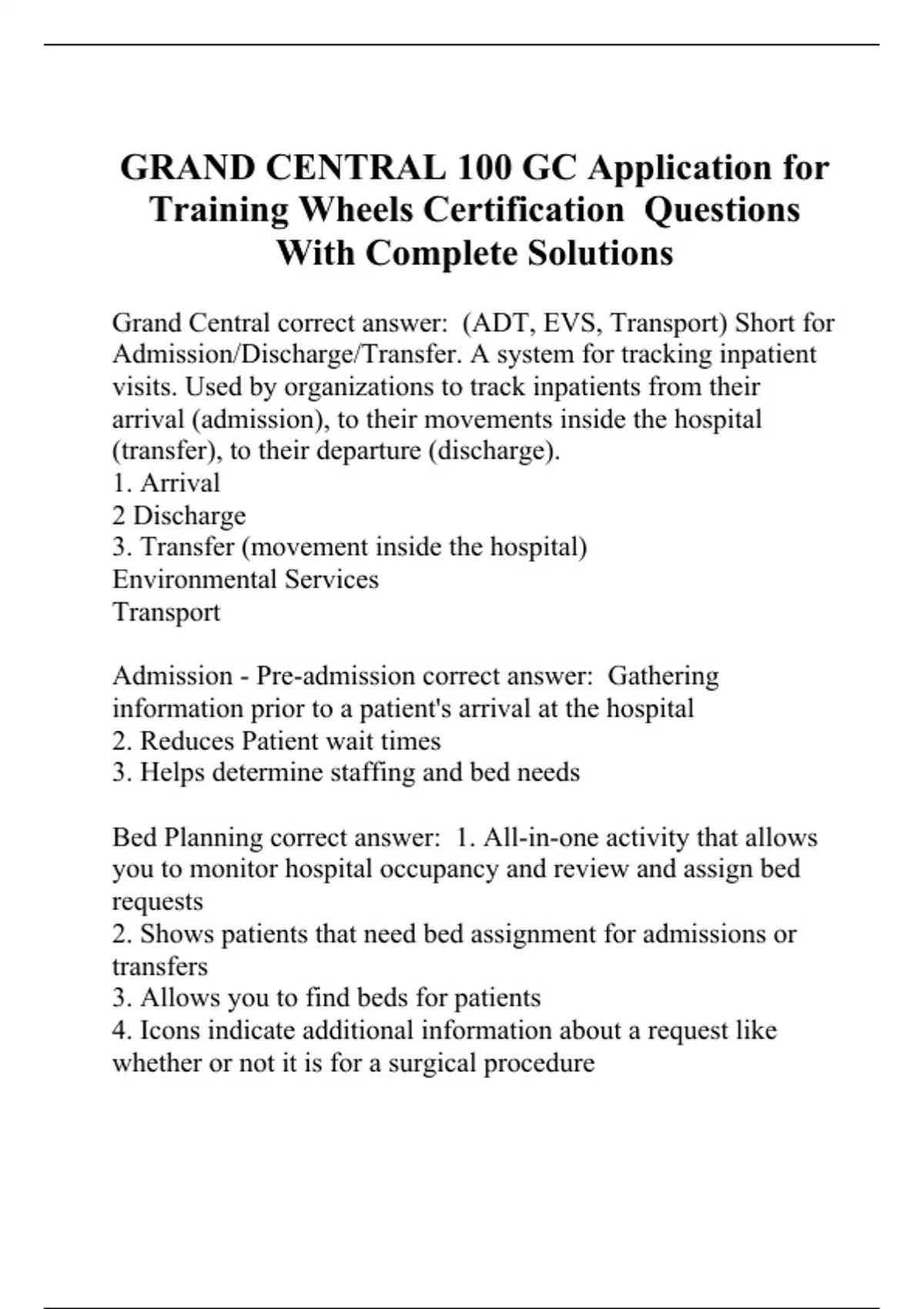 Grand Central correct answer: (ADT, EVS, Transport) Short for Admission/Discharge/Transfer. A system for tracking inpatient visits. Used by organizations to track inpatients from their arrival (admission), to their movements inside the hospital (transfer), to their departure (discharge). 1. Arrival 2 Discharge 3. Transfer (movement inside the hospital) Environmental Services Transport Admission - Pre-admission correct answer: Gathering information prior to a patient's arrival at the hospital 2. Reduces Patient wait times 3. Helps determine staffing and bed needs Bed Planning correct answer: 1. All-in-one activity that allows you to monitor hospital occupancy and review and assign bed requests 2. Shows patients that need bed assignment for admissions or transfers 3. Allows you to find beds for patients 4. Icons indicate additional information about a request like whether or not it is for a surgical procedure 5. Similar names are emphasized in bold and italics to help you tell them apart 6. Determines which unit group to display Bed Planning Sections correct answer: 1. Bed Request List = Displays/Tracks all bed requests for a hospital or group of hospitals a. Group drop down list = Grouping by Origin, Service, Patient, Context, and Target Unit 2. Right Side Bar = Shows data in news feed or patient bed information. 3. Middle Section = "Bed Board" Hospital occupancy Bed Planning Tabs correct answer: 1. Unassigned = Bed not assigned. Can use the drop down chevron by ownership to sort requests 2. Preassigned = Shows patient that have been targeted to a unit but do not have a specific room or bed assigned yet 3. Assigned = Show bed requests that have been assigned a specific room and bed. You can change, remove or cancel the assignment (select patient and right click for menu options) 4. Completed = Show requests for patients that have been transferred or admitted to the assigned room and bed 5. Postponed = Show bed requests that you have chosen to act on at a later time. After a specific amount of time has passed, the request will return to the unassigned tab to be acted upon (Deferred) 6. Upcoming = Show bed requests that don't require immediate action, but will soon be ready to plan. Will move automatically to the unassigned tab when they are ready to plan 7. Flight Tracker = Provides a comprehensive view of all the tabs in Bed Planning, including canceled requests The ONLY way to view canceled requests