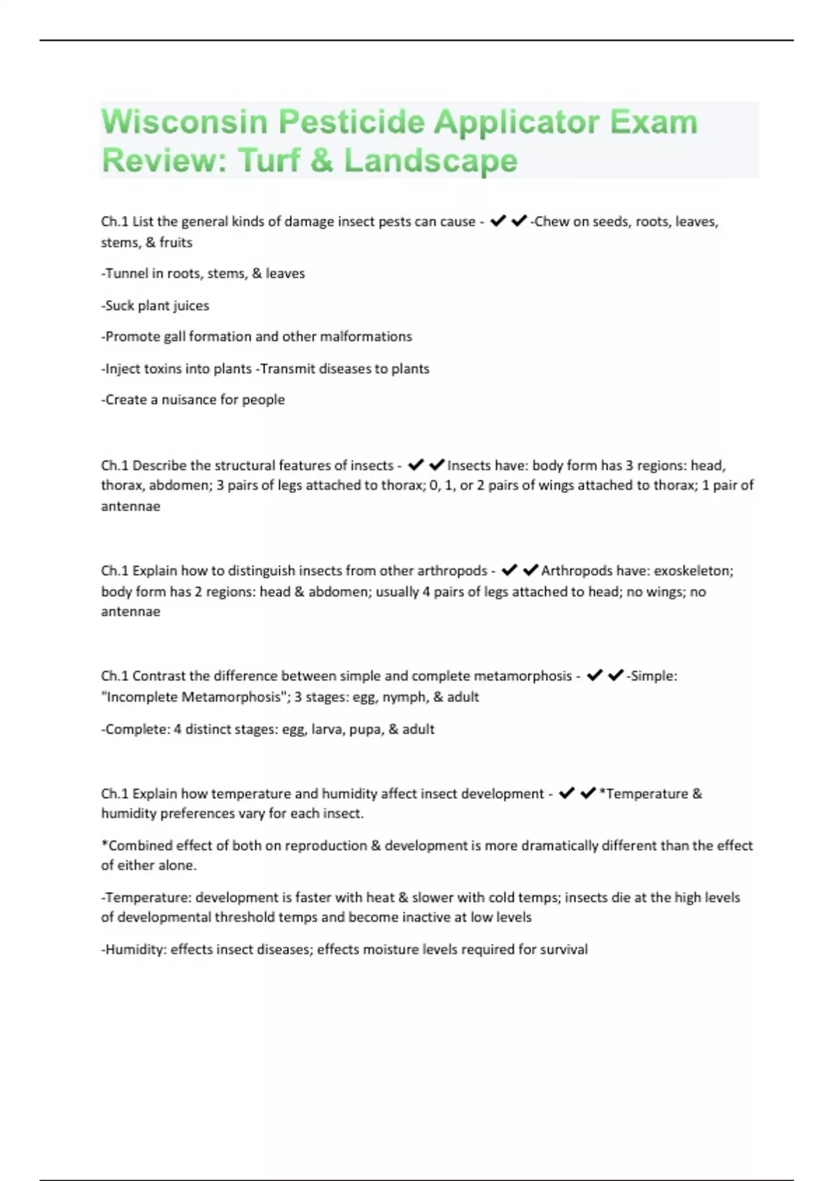 Ch.1 List the general kinds of damage insect pests can cause - -Chew on seeds, roots, leaves, stems, & fruits -Tunnel in roots, stems, & leaves -Suck plant juices -Promote gall formation and other malformations -Inject toxins into plants -Transmit diseases to plants -Create a nuisance for people Ch.1 Describe the structural features of insects - Insects have: body form has 3 regions: head, thorax, abdomen; 3 pairs of legs attached to thorax; 0, 1, or 2 pairs of wings attached to thorax; 1 pair of antennae Ch.1 Explain how to distinguish insects from other arthropods - Arthropods have: exoskeleton; body form has 2 regions: head & abdomen; usually 4 pairs of legs attached to head; no wings; no antennae Ch.1 Contrast the difference between simple and complete metamorphosis - -Simple: "Incomplete Metamorphosis"; 3 stages: egg, nymph, & adult -Complete: 4 distinct stages: egg, larva, pupa, & adult Ch.1 Explain how temperature and humidity affect insect development - *Temperature & humidity preferences vary for each insect. *Combined effect of both on reproduction & development is more dramatically different than the effect of either alone. -Temperature: development is faster with heat & slower with cold temps; insects die at the high levels of developmental threshold temps and become inactive at low levels -Humidity: effects insect diseases; effects moisture levels required for survivalCh.1 List the advantages and disadvantages of using insecticides - Advantages: -Effective against economically damaging pests -Can combine 1 or 2 insecticides to combat several pests -They act quickly to control pests before reaching damaging levels -For new pests, there are many compounds that have been proven effective -Effective insecticides, suitable formulations, & application equipment are normally available Disadvantages: -Often eliminate beneficial insects, allowing target organisms to rebound quickly -Repeated exposure can lead to resistance in a pest population -Yearly dependence on applications is an added cost -Always a potential for drift, residues, and damage Ch.2 Explain what determines whether a given plant is a weed - Weeds are unwanted plants
