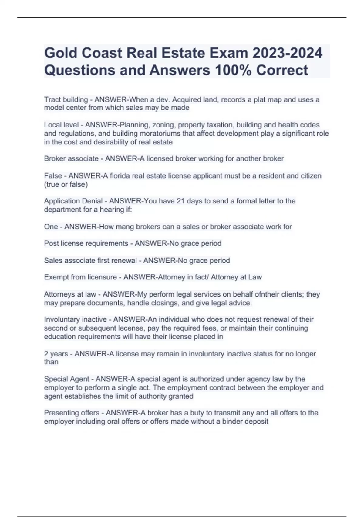Gold Coast Real Estate Exam Questions and Answers 100% CorrectGold Coast Real Estate Exam Questions and Answers 100% CorrectGold Coast Real Estate Exam Questions and Answers 100% Correct Tract building - ANSWER-When a dev. Acquired land, records a plat map and uses a model center from which sales may be made Local level - ANSWER-Planning, zoning, property taxation, building and health codes and regulations, and building moratoriums that affect development play a significant role in the cost and desirability of real estate Broker associate - ANSWER-A licensed broker working for another broker
