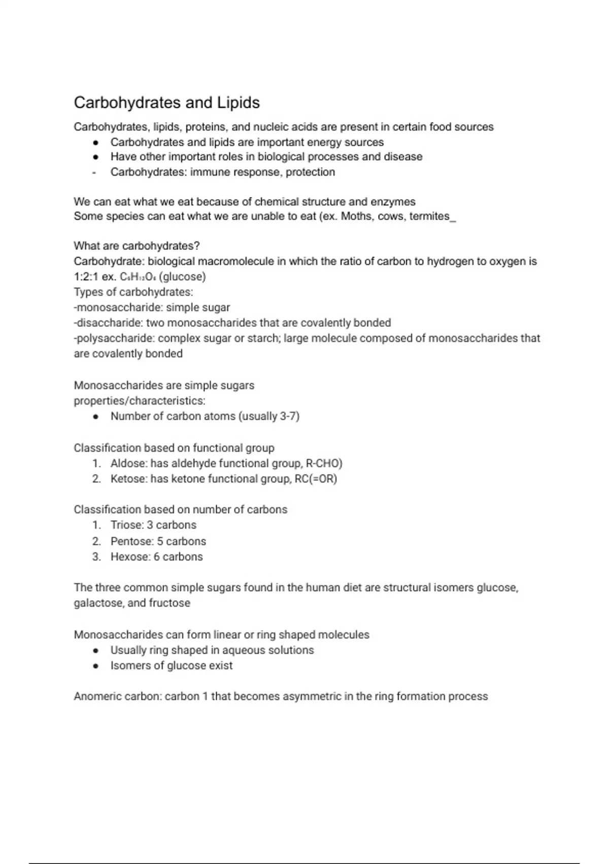 Definitions and examples of carbohydrates and lipids found within the human diet and body. Explanation of monosaccharides, disaccharides, and polysaccharides. Describes how to classify simple sugars.
