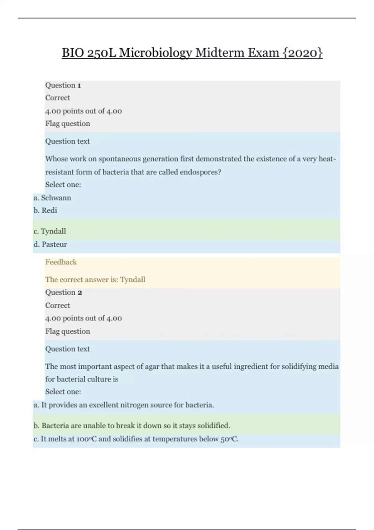 Question 1 Correct 4.00 points out of 4.00 Flag question Question text Whose work on spontaneous generation first demonstrated the existence of a very heat- resistant form of bacteria that are called endospores? Select one: a. Schwann b. Redi c. Tyndall d. Pasteur Feedback The correct answer is: Tyndall Question 2 Correct 4.00 points out of 4.00 Flag question