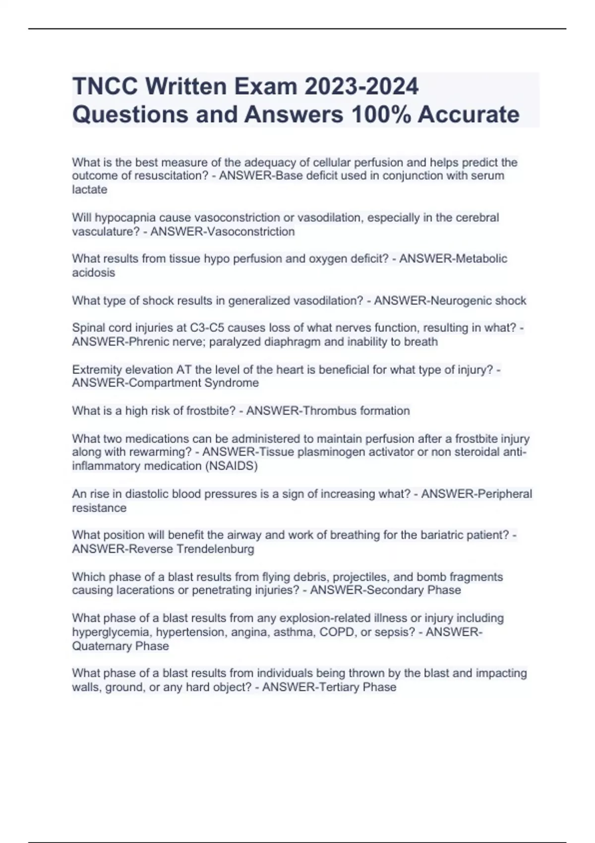 TNCC Written Exam Questions and Answers 100% AccurateTNCC Written Exam Questions and Answers 100% AccurateTNCC Written Exam Questions and Answers 100% AccurateTNCC Written Exam Questions and Answers 100% AccurateWhat is the best measure of the adequacy of cellular perfusion and helps predict the outcome of resuscitation? - ANSWER-Base deficit used in conjunction with serum lactate Will hypocapnia cause vasoconstriction or vasodilation, especially in the cerebral vasculature? - ANSWER-Vasoconstriction What results from tissue hypo perfusion and oxygen deficit? - ANSWER-Metabolic acidosis What type of shock results in generalized vasodilation? - ANSWER-Neurogenic shock Spinal cord injuries at C3-C5 causes loss of what nerves function, resulting in what? - ANSWER-Phrenic nerve; paralyzed diaphragm and inability to breath Extremity elevation AT the level of the heart is beneficial for what type of injury? - ANSWER-Compartment