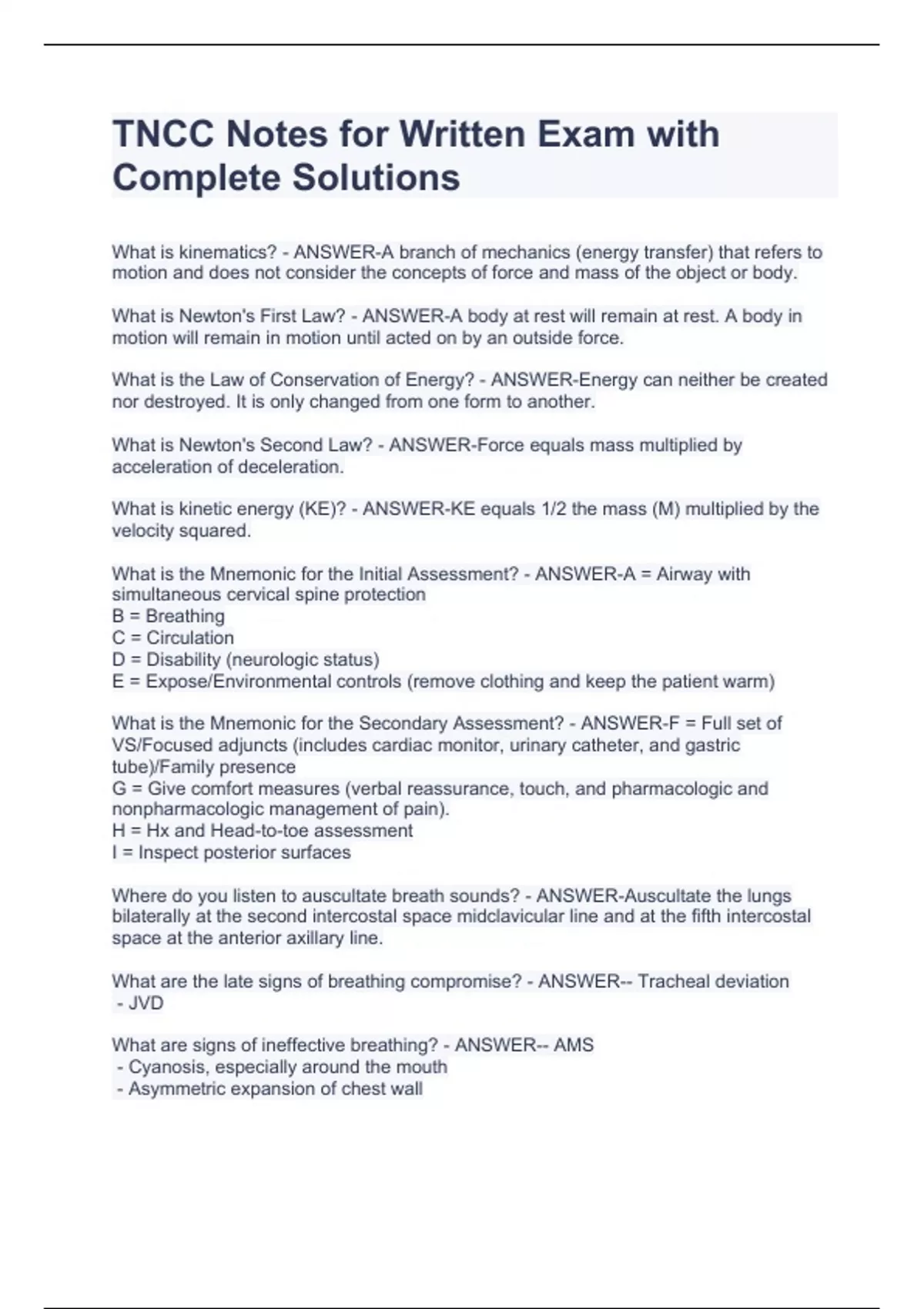 TNCC Notes for Written Exam with Complete Solutions TNCC Notes for Written Exam with Complete Solutions TNCC Notes for Written Exam with Complete Solutions TNCC Notes for Written Exam with Complete Solutions What is Newton's First Law? - ANSWER-A body at rest will remain at rest. A body in motion will remain in motion until acted on by an outside force. What is the Law of Conservation of Energy? - ANSWER-Energy can neither be created nor destroyed. It is only changed from one form to another.