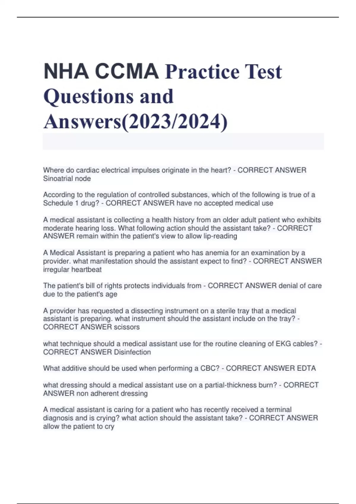 NHA CCMA Practice Test Questions and Answers(2023/2024) Where do cardiac electrical impulses originate in the heart? - CORRECT ANSWER Sinoatrial node According to the regulation of controlled substances, which of the following is true of a Schedule 1 drug? - CORRECT ANSWER have no accepted medical use A medical assistant is collecting a health history from an older adult patient who exhibits moderate hearing loss. What following action should the assistant take? - CORRECT ANSWER remain within the patient's view to allow lip-reading A Medical Assistant is preparing a patient who has anemia for an examination by a provider. what manifestation should the assistant expect to find? - CORRECT ANSWER irregular heartbeat The patient's bill of rights protects individuals from - CORRECT ANSWER denial of care due to the patient's age A provider has requested a dissecting instrument on a sterile tray that a medical assistant is preparing. what instrument should the assistant include on the tray? - CORRECT ANSWER scissors what technique should a medical assistant use for the routine cleaning of EKG cables? - CORRECT ANSWER Disinfection What additive should be used when performing a CBC? - CORRECT ANSWER EDTA what dressing should a medical assistant use on a partial-thickness burn? - CORRECT ANSWER non adherent dressing A medical assistant is caring for a patient who has recently received a terminal diagnosis and is crying? what action should the assistant take? - CORRECT ANSWER allow the patient to cry what position is appropriate for a pelvic examination? - CORRECT ANSWER lithotomy what document indicates how a patient's medical records will be used and disclosed by a medical office? - CORRECT ANSWER Notice of Private Practices (NPP) A medical assistant is reinforcing instructions with a patient about how to take a buccal tablet. what instructions should the assistant give the patient? - CORRECT ANSWER "place the tablet between the gums and cheek." A medical assistant is cleaning an examination room after assisting a provider with a biopsy. what action should the assistant take? - CORRECT ANSWER hold sharps by the blunt end to avoid needlestick injury a medical assistant is monitoring an infant patient for mircocephaly. what describes the anthropometric measurement that the assistant should perform? - CORRECT ANSWER head circumference what action should a medical assistant take when obtaining the length of an infant during a well-child visit? - CORRECT ANSWER position the infant on his back what instructions should a medical assistant give to a patient when administering an enteric-coated tablet? - CORRECT ANSWER "swallow the tablet whole with a glass of water." A provider examines an older adult patient who is disabled and has a lesion on her arm. And medical assistant should anticipate a referral for this patient to which of the following ancillary services? - CORRECT ANSWER Home health care A medical assistant in an emergency clinic is admitting several patients. The assistant should recognize that the provider should see which patient first? - CORRECT ANSWER an older adult patient who has diabetes and has a high blood pressure of 80/42 mm Hg a medical assistant is checking a patient's hearing using the Weber test. what action should the assistant take? - CORRECT ANSWER ask the patient if he hears the vibration louder in one ear than the other a medical assistant is reviewing laboratory requisitions. For which of the following patient conditions should assistant perform a capillary collection rather than a venipuncture? - CORRECT ANSWER previous thromboses when performing the palpatory method for obtaining blood pressure, what is the level at which the medical assistant should inflate the cuff? - CORRECT ANSWER 30 mm Hg above the radial pulse cessation a medical assistant should insert the needle at what angle during a venipuncture? - CORRECT ANSWER 15 degree angle a medical assistant is collecting information from a patient who reports persistent pain in the left upper quadrant. the assistant should note that this area contains which of the following organs? - CORRECT ANSWER stomach what position should a medical assistant place a healthy patient in preparation for a rectal examination? - CORRECT ANSWER Sims a medical assistant is preparing a patient who has bilateral below-the-knee amputations for an EKG. Which of the following sites should the assistant select for electrode placement? - CORRECT ANSWER abdomen a medical assistant is performing a fecal occult blood test using a guaiac card. which of the following actions should the assistant take? - CORRECT ANSWER interpret a blue color as a positive result a medical assistant works at a practice that is part of an Accountable Care Organization (ACO). This designation means that the practice's health care team will focus on improving care for patients who have which of the following types of medical insurance? - CORRECT ANSWER Medicare To provide culturally competent care, the medical assistant should - CORRECT ANSWER examine personal religious and cultural values and beliefs to identify any biases a medical assistant is assisting a provider with an abdominal examination. when the provider palpates the major portion of the liver, the assistant should recognize that he is palpating which of the following abdominal quadrants? - CORRECT ANSWER right upper a medical assistant is scheduling a patient for an outpatient procedure. what action should the assistant take first? - CORRECT ANSWER obtain an oral or written order from the provider a medical assistant is caring for an infant who suddenly becomes unresponsive for unknown reasons. what action should the assistant take? - CORRECT ANSWER initiate cardiopulmonary resuscitation a medical assistant is reviewing a patient's medical history prior to the patient's appointment. which of the following laboratory results indicates the need to schedule an extension of the current visit? - CORRECT ANSWER fas