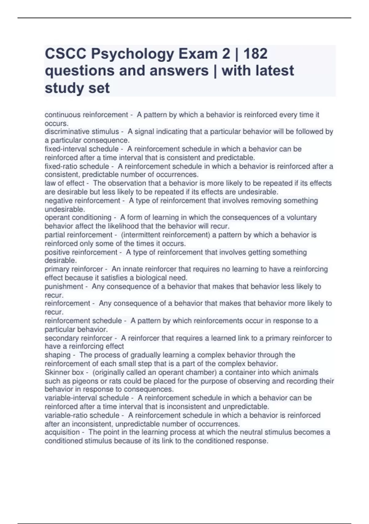 CSCC Psychology Exam 2 | 182 questions and answers | with latest study set continuous reinforcement - A pattern by which a behavior is reinforced every time it occurs. discriminative stimulus - A signal indicating that a particular behavior will be followed by a particular consequence. fixed-interval schedule - A reinforcement schedule in which a behavior can be reinforced after a time interval that is consistent and predictable. fixed-ratio schedule - A reinforcement schedule in which a behavior is reinforced after a consistent, predictable number of occurrences. law of effect - The observation that a behavior is more likely to be repeated if its effects are desirable but less likely to be repeated if its effects are undesirable. negative reinforcement - A type of reinforcement that involves removing something undesirable. operant conditioning - A form of learning in which the consequences of a voluntary behavior affect the likelihood that the behavior will recur. partial reinforcement - (intermittent reinforcement) a pattern by which a behavior is reinforced only some of the times it occurs. positive reinforcement - A type of reinforcement that involves getting something desirable. primary reinforcer - An innate reinforcer that requires no learning to have a reinforcing effect because it satisfies a biological need. punishment - Any consequence of a behavior that makes that behavior less likely to recur. reinforcement - Any consequence of a behavior that makes that behavior more likely to recur. reinforcement schedule - A pattern by which reinforcements occur in response to a particular behavior. secondary reinforcer - A reinforcer that requires a learned link to a primary reinforcer to have a reinforcing effect shaping - The process of gradually learning a complex behavior through the reinforcement of each small step that is a part of the complex behavior. Skinner box - (originally called an operant chamber) a container into which animals such as pigeons or rats could be placed for the purpose of observing and recording their behavior in response to consequences. variable-interval schedule - A reinforcement schedule in which a behavior can be reinforced after a time interval that is inconsistent and unpredictable. variable-ratio schedule - A reinforcement schedule in which a behavior is reinforced after an inconsistent, unpredictable number of occurrences. acquisition - The point in the learning process at which the neutral stimulus becomes a conditioned stimulus because of its link to the conditioned response. classical conditioning - A form of learning in which animals or people make a connection between two stimuli that have occurred together, such that one predicts the other. conditioned response - The response to a conditioned stimulus acquired through learning. conditioned stimulus - A formerly neutral stimulus that now causes a response because of its link to an unconditioned stimulus. discrimination - The learning process by which stimuli that are different from the conditioned stimulus fail to cause the same conditioned response. extinction - The point in the learning process at which the conditioned stimulus no longer causes the conditioned response because it is no longer linked to the unconditioned stimulus. generalization - The learning process by which stimuli that are similar to the conditioned stimulus cause the same conditioned response. higher-order conditioning - Classical conditioning that involves three or more stimuli. learning - The process by which life experience causes change in the behavior or thinking of an organism. neutral stimulus - A stimulus that causes no response at all. spontaneous recovery - After a temporary period of inactivity, the return of a conditioned response that had become extinct. unconditioned response - The automatic response to a stimulus that occurs naturally, without any need for learning. unconditioned stimulus - A stimulus that causes a response automatically, without any need for learning. vicarious conditioning - Conditioning that takes place via observation of others' life experiences rather than one's own. mirror neurons - Neurons that are thought to underlie empathy and imitation and that activate when a person performs or observes a particular behavior. observational learning - A type of learning that occurs as a result of observing others' behavior and consequences rather than our own. cognitive map - A mental diagram of the physical environment as it is initially explored when no reinforcement is available. insight - The perception of a solution to a problem that results from cognitive understanding rather than from trial and error. latent learning - A type of learning that has taken place but cannot be directly observed. learned helplessness - The absence of any attempt to help oneself that results from previously learning that such attempts are useless. biological preparedness - An animal's evolutionary predisposition to learn that which is most relevant to the survival of that species. instinctive drift - The tendency of animals' behavior to return to innate, genetically programmed patterns. affect heuristic - An educated guess in which the worth of something is strongly influenced by how a person feels toward it. affective forecasting - Predicting how a person will feel about the outcomes of his or her decisions. algorithm - A formula-like method of problem solving. anchoring heuristic - An educated guess in which the starting point has a strong influence on the conclusion that is ultimately reached. availability heuristic - An educated guess based on the information that most quickly and easily comes to mind. cognition - What the brain does with information, including understanding it, organizing it, analyzing it, and communicating it.