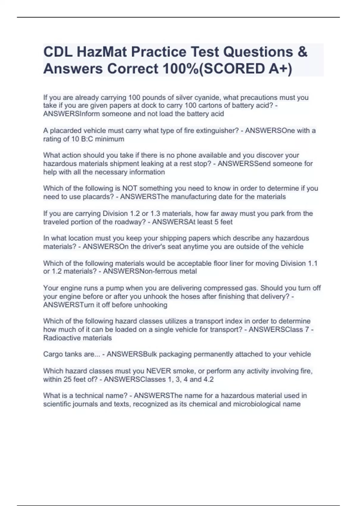 If you are already carrying 100 pounds of silver cyanide, what precautions must you take if you are given papers at dock to carry 100 cartons of battery acid? - ANSWERSInform someone and not load the battery acid A placarded vehicle must carry what type of fire extinguisher? - ANSWERSOne with a rating of 10 B:C minimum What action should you take if there is no phone available and you discover your hazardous materials shipment leaking at a rest stop? - ANSWERSSend someone for help with all the necessary information CDL HazMat Practice Test Questions & Answers Correct 100%(SCORED A+) u need to know in order to determine if you need to use placards? - ANSWERSThe CDL HazMat Practice Test Questions & Answers Correct 100%(SCORED A+)