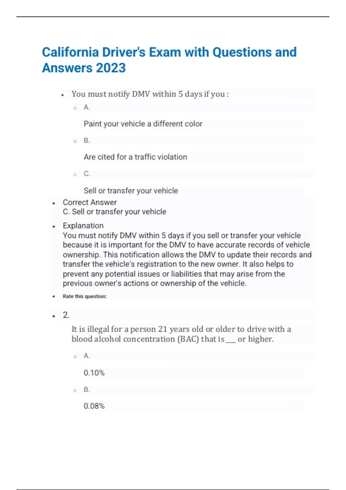 CALIFORNIA DRIVER’S EXAMs QUESTIONS AND ANSWERS 2023/2024