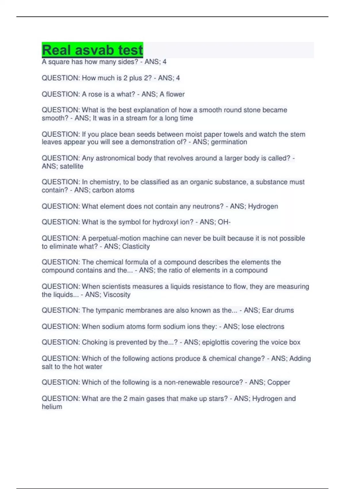 Real asvab test A square has how many sides? - ANS; 4 QUESTION: How much is 2 plus 2? - ANS; 4 QUESTION: A rose is a what? - ANS; A flower QUESTION: What is the best explanation of how a smooth round stone became smooth? - ANS; It was in a stream for a long time QUESTION: If you place bean seeds between moist paper towels and watch the stem leaves appear you will see a demonstration of? - ANS; germination QUESTION: Any astronomical body that revolves around a larger body is called? - ANS; satellite QUESTION: In chemistry, to be classified as an organic substance, a substance must contain? - ANS; carbon atoms QUESTION: What element does not contain any neutrons? - ANS; Hydrogen QUESTION: What is the symbol for hydroxyl ion? - ANS; OHQUESTION: A perpetual-motion machine can never be built because it is not possible to eliminate what? - ANS; Clasticity QUESTION: The chemical formula of a compound describes the elements the compound contains and the... - ANS; the ratio of elements in a compound QUESTION: When scientists measures a liquids resistance to flow, they are measuring the liquids... - ANS; Viscosity QUESTION: The tympanic membranes are also known as the... - ANS; Ear drums QUESTION: When sodium atoms form sodium ions they: - ANS; lose electrons QUESTION: Choking is prevented by the...? - ANS; epiglottis covering the voice box QUESTION: Which of the following actions produce & chemical change? - ANS; Adding salt to the hot water QUESTION: Which of the following is a non-renewable resource? - ANS; Copper QUESTION: What are the 2 main gases that make up stars? - ANS; Hydrogen and heliumQUESTION: A radar is designed to report the track of an aircraft every second. If this radar reports 30 tracks in one minute, what percentage of the time did the radar track the aircraft? - ANS; 50%