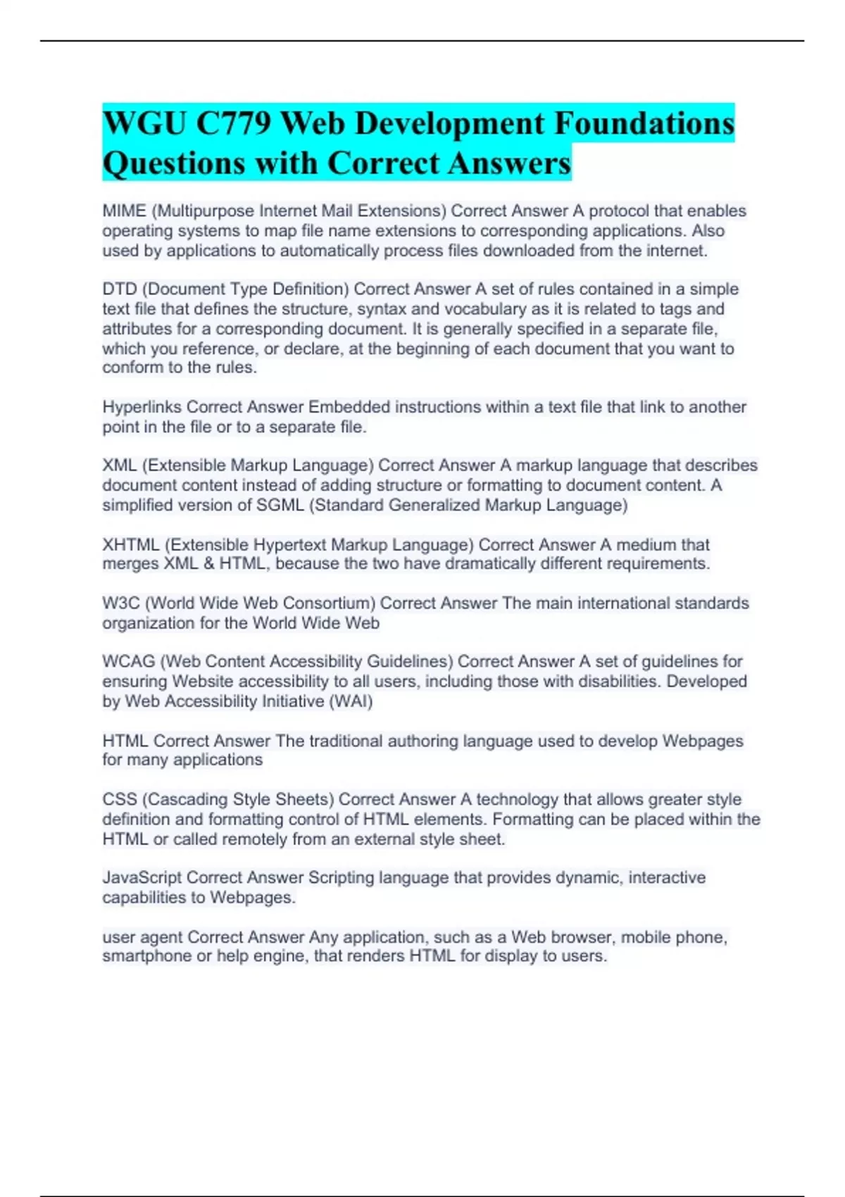 MIME (Multipurpose Internet Mail Extensions) Correct Answer A protocol that enables operating systems to map file name extensions to corresponding applications. Also used by applications to automatically process files downloaded from the internet. DTD (Document Type Definition) Correct Answer A set of rules contained in a simple text file that defines the structure, syntax and vocabulary as it is related to tags and attributes for a corresponding document. It is generally specified in a separate file, which you reference, or declare, at the beginning of each document that you want to conform to the rules. Hyperlinks Correct Answer Embedded instructions within a text file that link to another point in the file or to a separate file. XML (Extensible Markup Language) Correct Answer A markup language that describes document content instead of adding structure or formatting to document content. A simplified version of SGML (Standard Generalized Markup Language) XHTML (Extensible Hypertext Markup Language) Correct Answer A medium that merges XML & HTML, because the two have dramatically different requirements. W3C (World Wide Web Consortium) Correct Answer The main international standards organization for the World Wide Web WCAG (Web Content Accessibility Guidelines) Correct Answer A set of guidelines for ensuring Website accessibility to all users, including those with disabilities. Developed by Web Accessibility Initiative (WAI) HTML Correct Answer The traditional authoring language used to develop Webpages for many applications CSS (Cascading Style Sheets) Correct Answer A technology that allows greater style definition and formatting control of HTML elements. Formatting can be placed within the HTML or called remotely from an external style sheet. JavaScript Correct Answer Scripting language that provides dynamic, interactive capabilities to Webpages. user agent Correct Answer Any application, such as a Web browser, mobile phone, smartphone or help engine, that renders HTML for display to users.