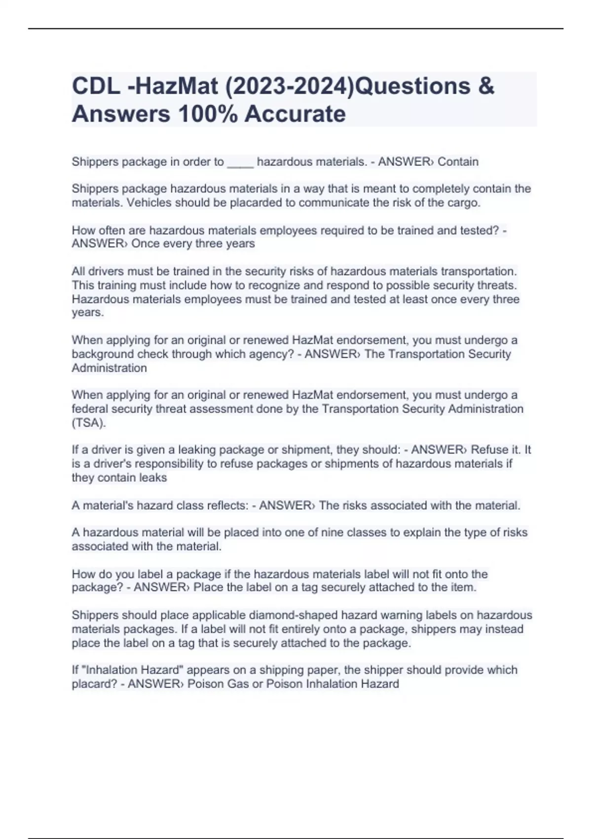 Shippers package in order to ____ hazardous materials. - ANSWER› Contain Shippers package hazardous materials in a way that is meant to completely contain the materials. Vehicles should be placarded to communicate the risk of the cargo. How often are hazardous materials employees required to be trained and tested? - ANSWER› Once every three years All drivers must be trained in the security risks of hazardous materials transportation. This training must include how to recognize and respond to possible security threats. Hazardous materials employees must be trained and tested at least once every three years. When applying for an original or renewed HazMat endorsement, you must undergo a background check through which agency? - ANSWER› The Transportation Security Administration When applying for an original or renewed HazMat endorsement, you must undergo a federal security threat assessment done by the Transportation Security Administration (TSA). If a driver is given a leaking package or shipment, they should: - ANSWER› Refuse it. It is a driver's responsibility to refuse packages or shipments of hazardous materials if they contain leaks CDL -HazMat ()Questions & Answers 100% Accurate
