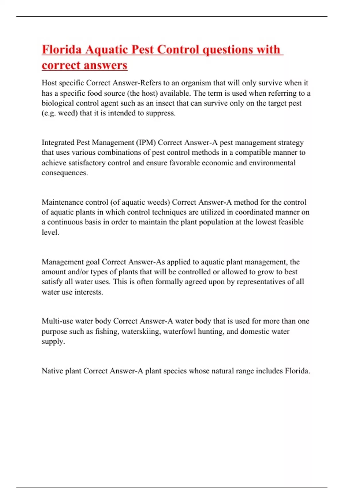Florida Aquatic Pest Control questions with correct answers