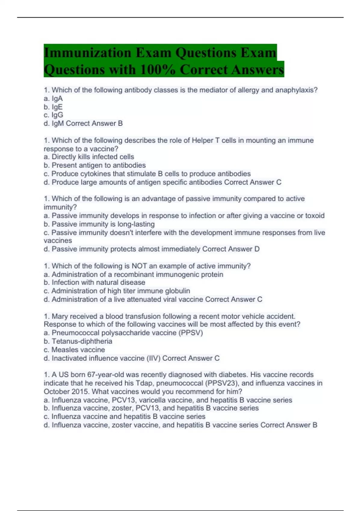 1. Which of the following antibody classes is the mediator of allergy and anaphylaxis? a. IgA b. IgE c. IgG d. IgM Correct Answer B 1. Which of the following describes the role of Helper T cells in mounting an immune response to a vaccine? a. Directly kills infected cells b. Present antigen to antibodies c. Produce cytokines that stimulate B cells to produce antibodies d. Produce large amounts of antigen specific antibodies Correct Answer C 1. Which of the following is an advantage of passive immunity compared to active immunity? a. Passive immunity develops in response to infection or after giving a vaccine or toxoid b. Passive immunity is long-lasting c. Passive immunity doesn't interfere with the development immune responses from live vaccines d. Passive immunity protects almost immediately Correct Answer D 1. Which of the following is NOT an example of active immunity? a. Administration of a recombinant immunogenic protein b. Infection with natural disease c. Administration of high titer immune globulin d. Administration of a live attenuated viral vaccine Correct Answer C 1. Mary received a blood transfusion following a recent motor vehicle accident. Response to which of the following vaccines will be most affected by this event? a. Pneumococcal polysaccharide vaccine (PPSV) b. Tetanus-diphtheria c. Measles vaccine d. Inactivated influence vaccine (IIV) Correct Answer C 1. A US born 67-year-old was recently diagnosed with diabetes. His vaccine records indicate that he received his Tdap, pneumococcal (PPSV23), and influenza vaccines in October 2015. What vaccines would you recommend for him? a. Influenza vaccine, PCV13, varicella vaccine, and hepatitis B vaccine series b. Influenza vaccine, zoster, PCV13, and hepatitis B vaccine series c. Influenza vaccine and hepatitis B vaccine series d. Influenza vaccine, zoster vaccine, and hepatitis B vaccine series Correct Answer B