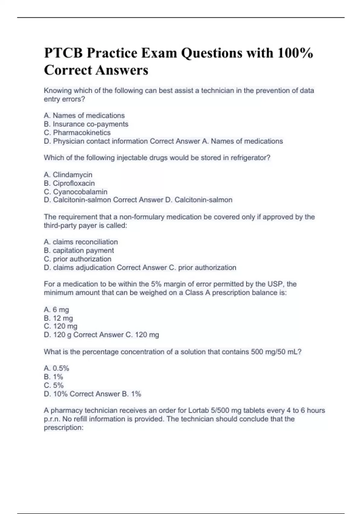 Knowing which of the following can best assist a technician in the prevention of data entry errors? A. Names of medications B. Insurance co-payments C. Pharmacokinetics D. Physician contact information Correct Answer A. Names of medications Which of the following injectable drugs would be stored in refrigerator? A. Clindamycin B. Ciprofloxacin C. Cyanocobalamin D. Calcitonin-salmon Correct Answer D. Calcitonin-salmon The requirement that a non-formulary medication be covered only if approved by the third-party payer is called: A. claims reconciliation B. capitation payment C. prior authorization D. claims adjudication Correct Answer C. prior authorization For a medication to be within the 5% margin of error permitted by the USP, the minimum amount that can be weighed on a Class A prescription balance is: A. 6 mg B. 12 mg C. 120 mg D. 120 g Correct Answer C. 120 mg What is the percentage concentration of a solution that contains 500 mg/50 mL? A. 0.5% B. 1% C. 5% D. 10% Correct Answer B. 1% A pharmacy technician receives an order for Lortab 5/500 mg tablets every 4 to 6 hours p.r.n. No refill information is provided. The technician should conclude that the prescription: