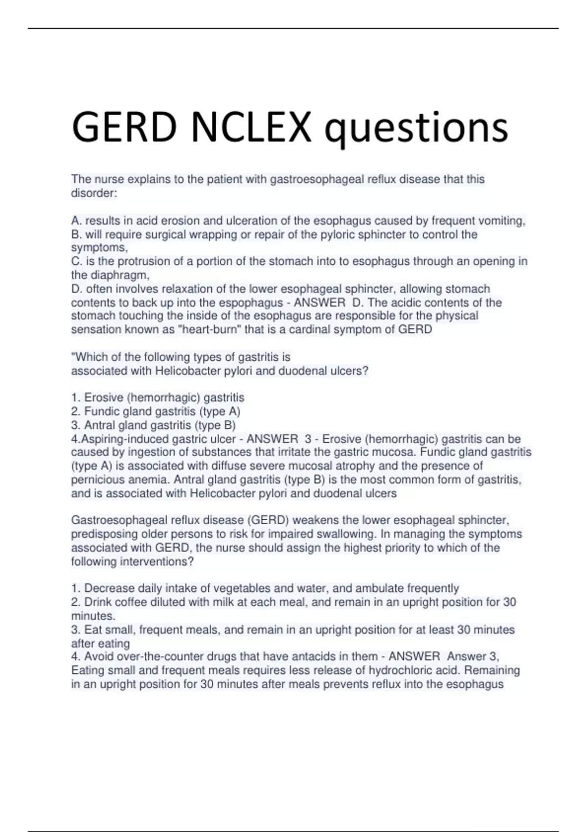 GERD NCLEX questions and correct answers
