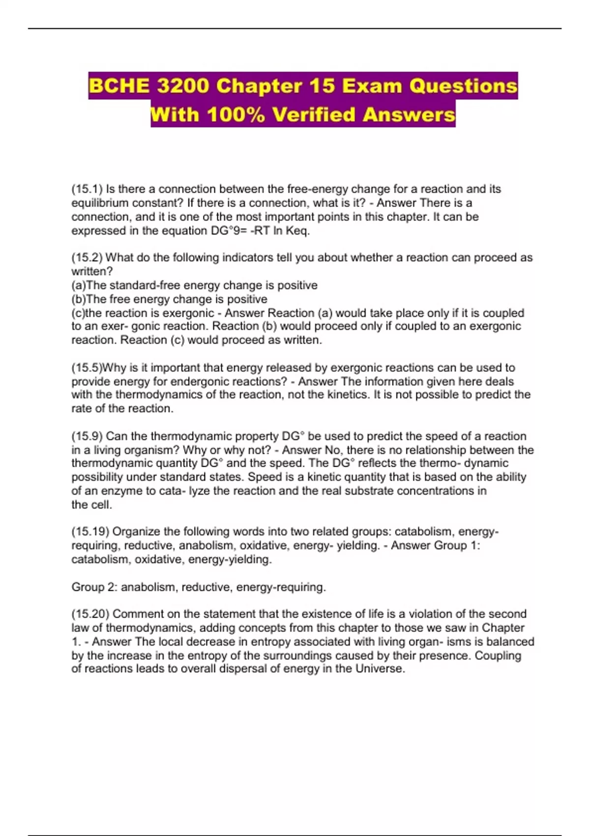 BCHE 3200 Chapter 15 Exam Questions With 100% Verified Answers...