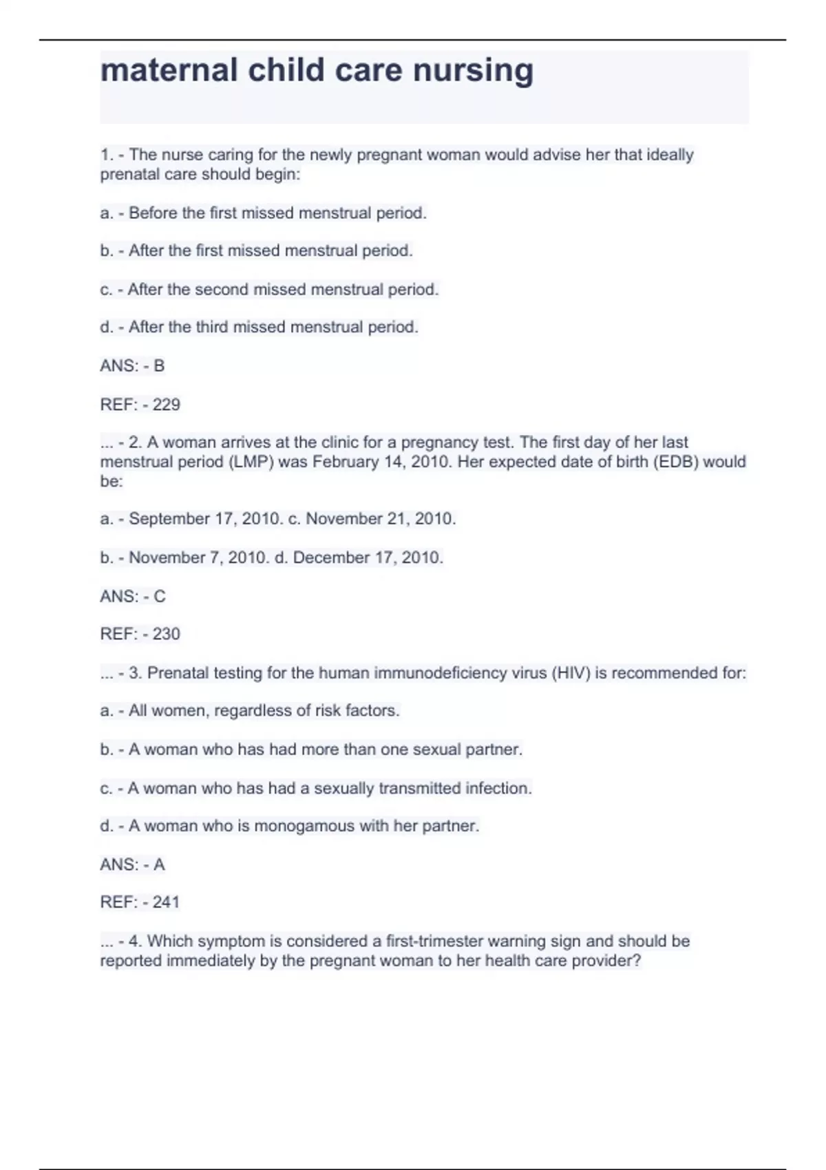 1. - The nurse caring for the newly pregnant woman would advise her that ideally prenatal care should begin: a. - Before the first missed menstrual period. b. - After the first missed menstrual period. c. - After the second missed menstrual period. d. - After the third missed menstrual period