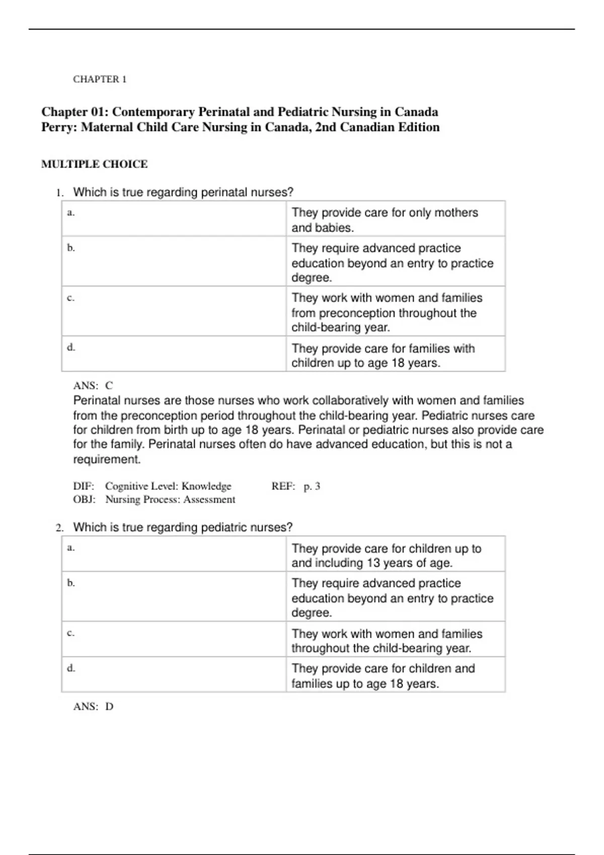 Test Bank for Maternal Child Nursing Care in Canada 2nd Edition 1. Which is true regarding perinatal nurses? a. They provide care for only mothers and babies. b. They require advanced practice education beyond an entry to practice degree. c. They work with women and families from preconception throughout the child-bearing year. d. They provide care for families with children up to age 18 years. ANS: C Perinatal nurses are those nurses who work collaboratively with women and families from the preconception period throughout the child-bearing year. Pediatric nurses care for children from birth up to age 18 years. Perinatal or pediatric nurses also provide care for the family. Perinatal nurses often do have advanced education, but this is not a requirement. DIF: Cognitive Level: Knowledge REF: p. 3 OBJ: Nursing Process: Assessment 2. Which is true regarding pediatric nurses? a. They provide care for children up to and including 13 years of age. b. They require advanced practice education beyond an entry to practice degree. c. They work with women and families throughout the child-bearing year. d. They provide care for children and families up to age 18 years. ANS: D Pediatric nurses care for children from birth up to age 18 years. Perinatal nurses are those nurses who work collaboratively with women and families from the preconception period throughout the child-bearing year. Perinatal and pediatric nurses also provide care for the family. Pediatric nurses often do have advanced education, but this is not a requirement. DIF: Cognitive Level: Analysis REF: p. 3 OBJ: Nursing Process: Assessment 3. According to the Institute of Safe Medication Practices Canada (ISMP) “Do Not Use” list, which is correct? a. Administer heparin 100 U S/C QID b. Administer insulin 7 units OD c. Administer polysporin gtts to both eyes daily d. Administer 5 cc heparin into saline lock daily ANS: C Polysporin gtts to both eyes daily is correct. Units should be written out and not abbreviated as “U”; S/C should be “SUBCUT”; OD should be written out as “daily”; and “cc” is not to be used, but “mL” is to be used for volume measurements. DIF: Cognitive Level: Application REF: p. 10 | Table 1-2 OBJ: Nursing Process: Implementation 4. An Indigenous woman is pregnant with her first child. Which evidence-informed intervention is most important for the nurse to implement? a. Perform a nutrition assessment. b. Refer the woman to a social worker. c. Advise the woman to see an obstetrician, not a midwife. d. Explain to the woman the importance of keeping her prenatal care appointments. ANS: D Consistent prenatal care is associated with healthier infants. Nutritional status is an important modifiable risk factor, but it is not the most important action a nurse should take in this situation. The patient may need assistance from a social worker at some time during her pregnancy, but a referral to a social worker is not the most important aspect the nurse should address at this time. If the woman has identifiable high-risk problems, her health care may need to be provided by a physician