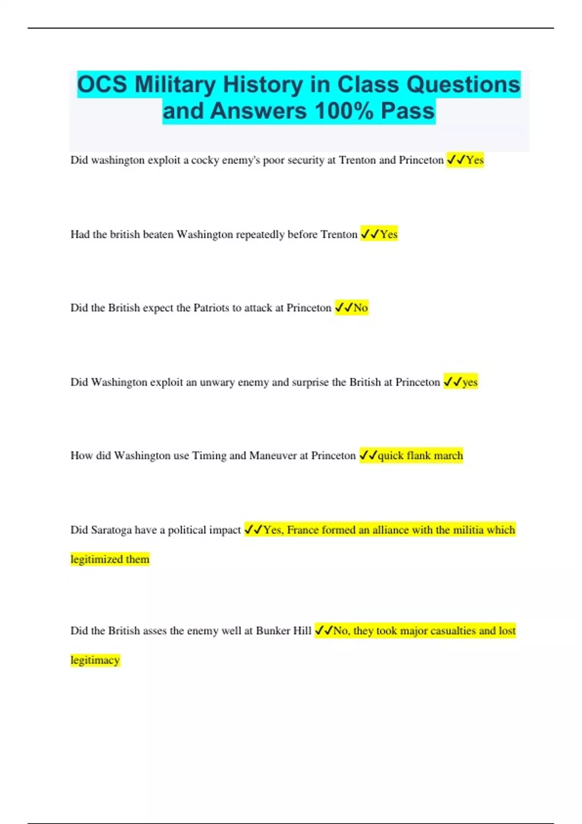 OCS Military History in Class Questions and Answers 100% Pass Did washington exploit a cocky enemy's poor security at Trenton and Princeton Yes Had the british beaten Washington repeatedly before Trenton Yes Did the British expect the Patriots to attack at Princeton No Did Washington exploit an unwary enemy and surprise the British at Princeton yes How did Washington use Timing and Maneuver at Princeton quick flank march Did Saratoga have a political impact Yes, France formed an alliance with the militia which legitimized them Did the British asses the enemy well at Bunker Hill No, they took major casualties and lost legitimacy Who misused terrain at King's Mountain British (skylined) Did Morgan use METT-TC OAKOC well at Cowpens Yes, double envelopment Is terrain the only issue the US faced in the Second Seminole War no (weather, disease, terrain) Compare Resaca de La Palma to Palo Alto With the open terrain and wide fields of fire, Taylor relied heavily on artillery at Palo Alto. At Resaca De La Palma he had to utilize infantry since the terrain was too difficult to maneuver artillery through Did disease and weather delay Taylor's Monterrey Campaign yes How did Taylor perform at the Battle of Buena Vista Taylor had great leadership, great planning, great use of terrain What trinity is dominant during Scott's Anaconda Plan Rational Aims and Policy Is McClellan an offensive commander no (timid) Compare Van Dorn and Sibley's Campaigns both don't care about LOCs, are forced to abandon their campaigns What challenges did the Rebels face at the Battle of Shiloh swampy terrain =disrupts attack, poor coordination & communication, poor fire support maneuver Did the Rebels face combined arms challenges at the Battle of Shiloh Yes, communication, organization, terrain, maneuver Did Stonewall Jackson use interior lines well in Shenandoah yes, Jackson defeats union with interior lines Who wins all the battles at the Seven Days battle McCellen (timid) held his position Political result of the Battle of Antietam South (Lee) does not get European support or win over Maryland, Emancipation Proclamation