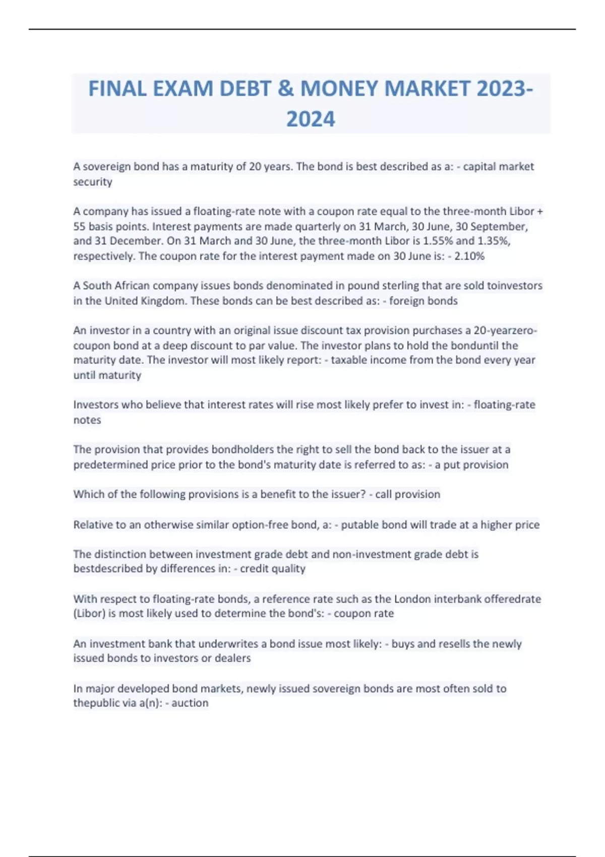 Final Exam Debt & Money Market