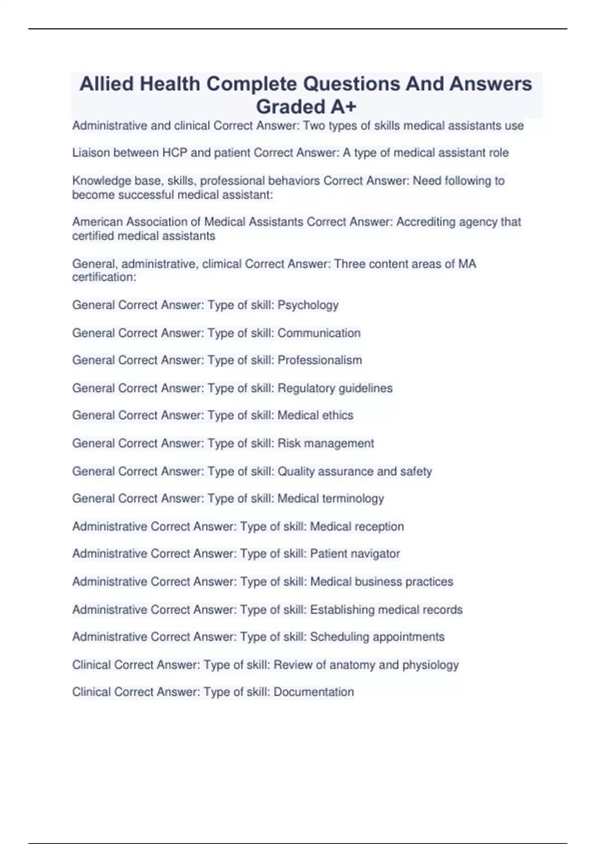 allied health complete questions and answers grade